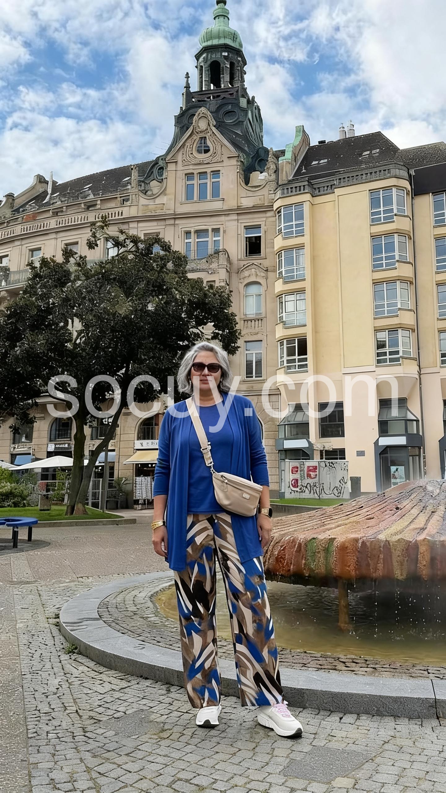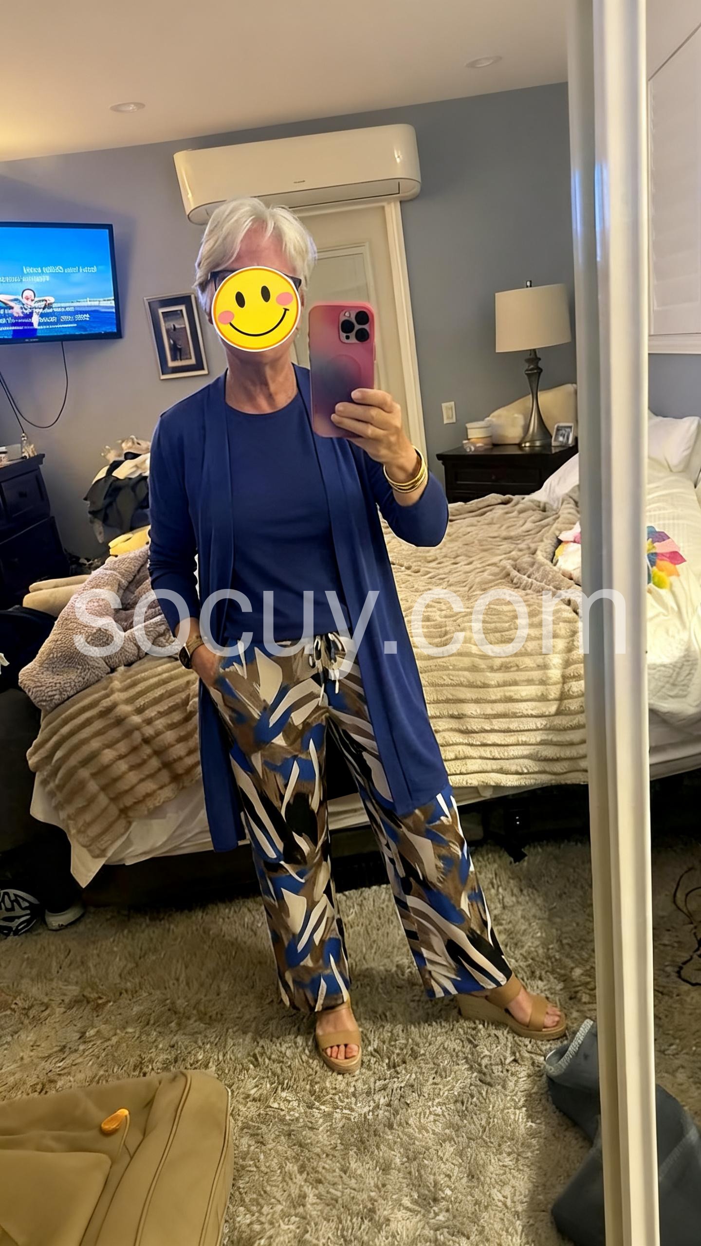 This coordinated outfit features a sleek blue cardigan over a matching top. The wide-leg palazzo pants have a bold abstract print in blue, beige, and black. Perfect for casual elegance or relaxed outings. Lightweight fabrics ensure comfort all day. Ideal for spring and summer wear.