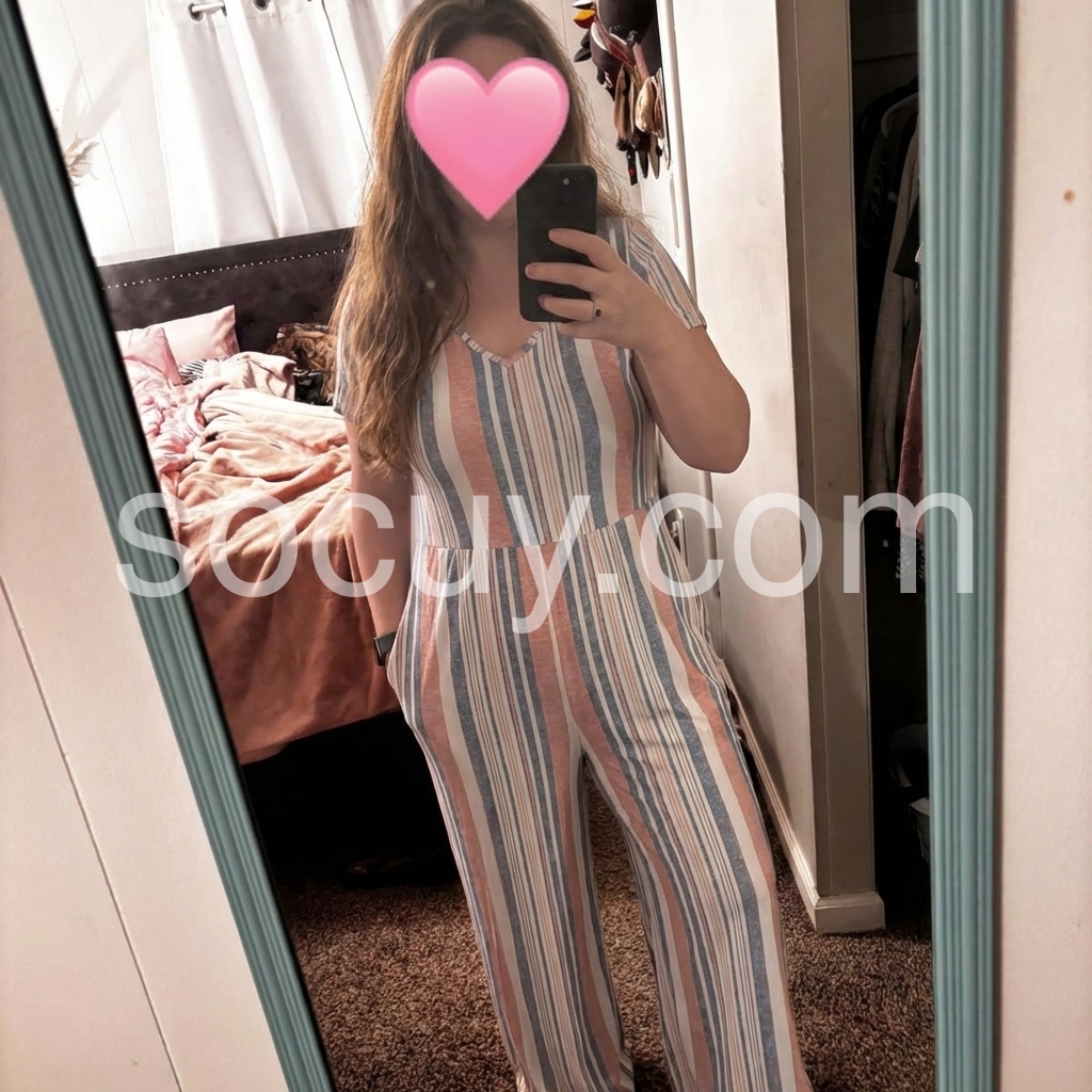 This striped jumpsuit features a soft blend of peach, blue, and cream vertical stripes for a relaxed, beach-ready look. The V-neckline and short sleeves add a feminine touch, while wide-leg pants ensure comfort and ease. Side pockets offer practicality and style. Perfect for casual days, vacations, or warm-weather outings. Lightweight fabric keeps you cool and comfortable all day.