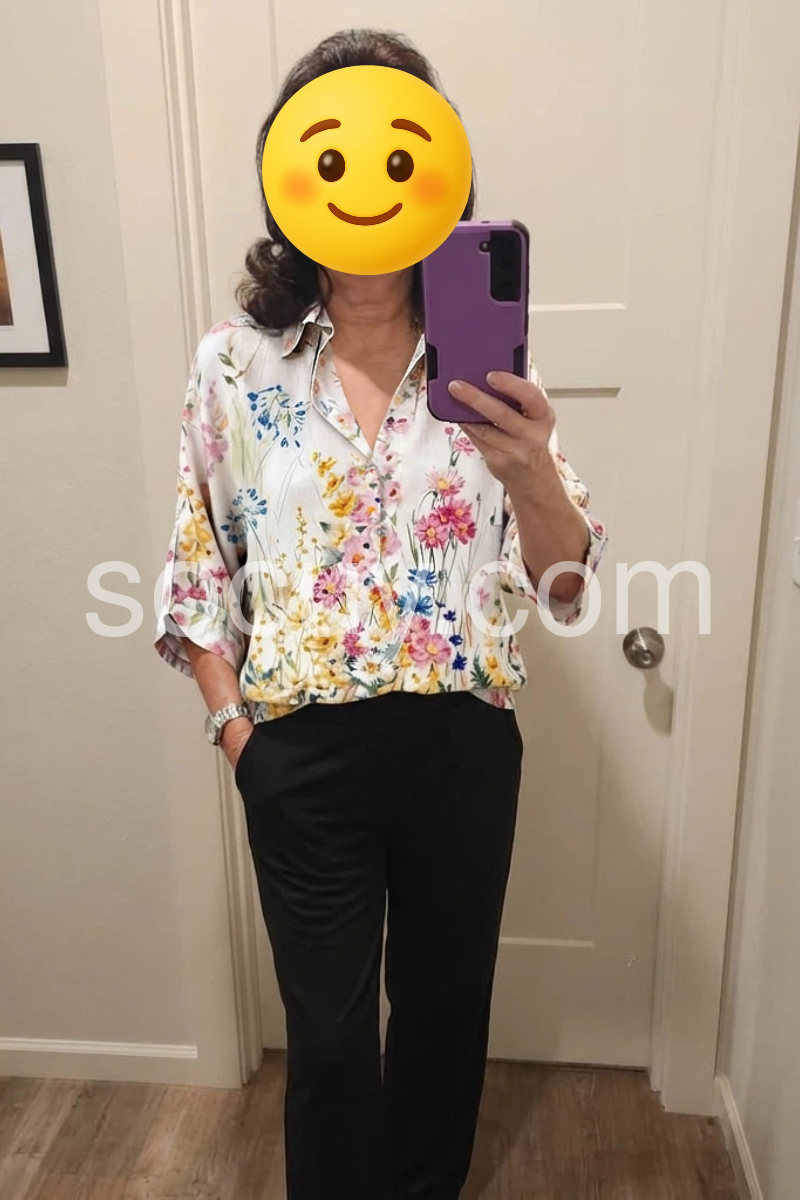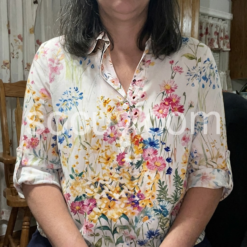 This loose-fit top features a colorful floral print on a soft cream base. V-neck design with a relaxed collar and rolled sleeves adds charm. Lightweight fabric perfect for spring and summer. Pair with jeans or shorts for a fresh look. Effortlessly stylish with a boho vibe.