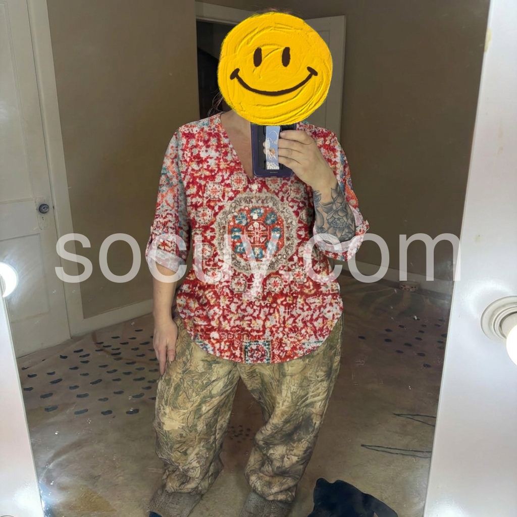 The V-neck, button-front design, and cuffed 3/4 sleeves offer a relaxed, flattering fit.