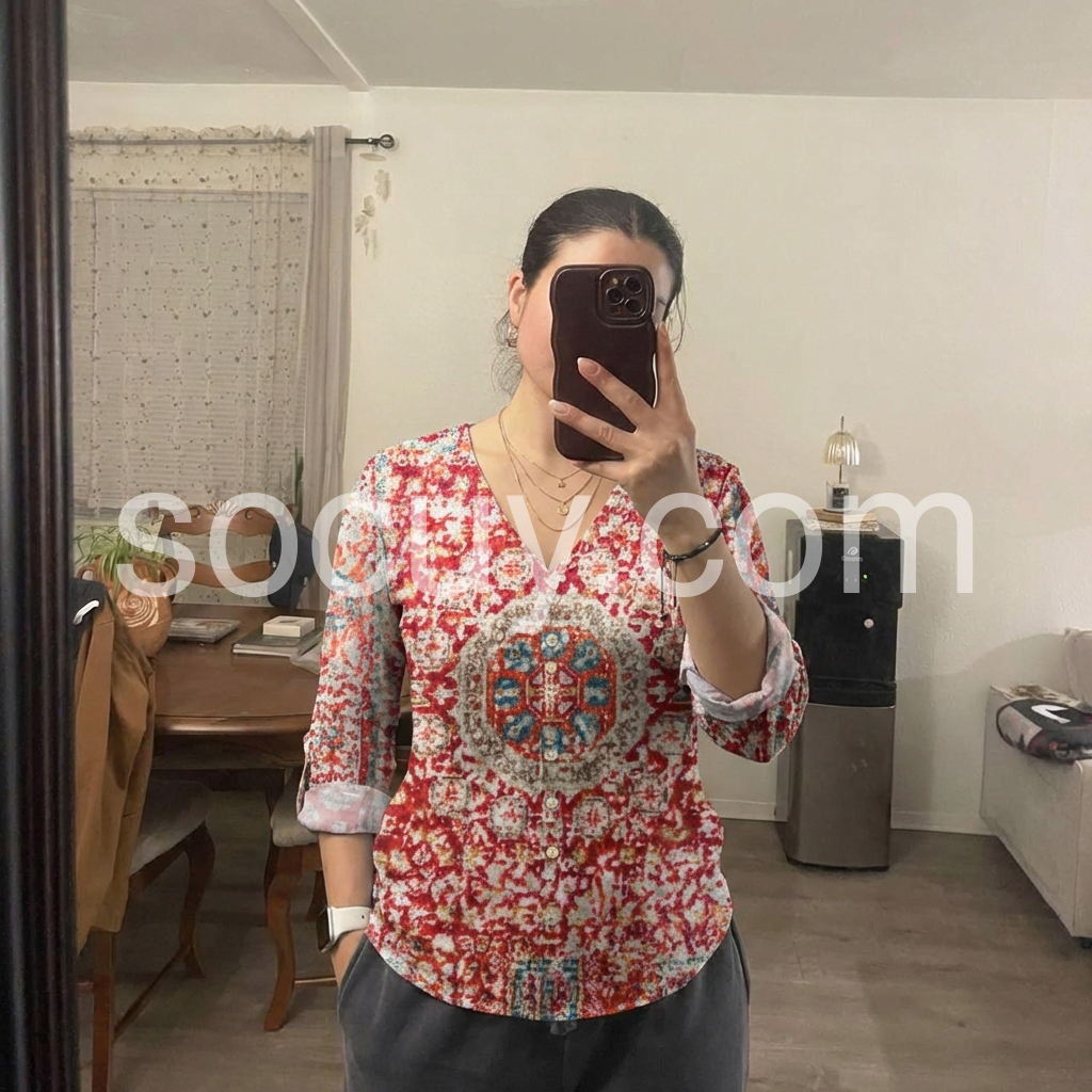 This blouse is a wearable celebration of bohemian artistry. The vibrant red base, printed with intricate ethnic-inspired geometric motifs, makes a bold statement.