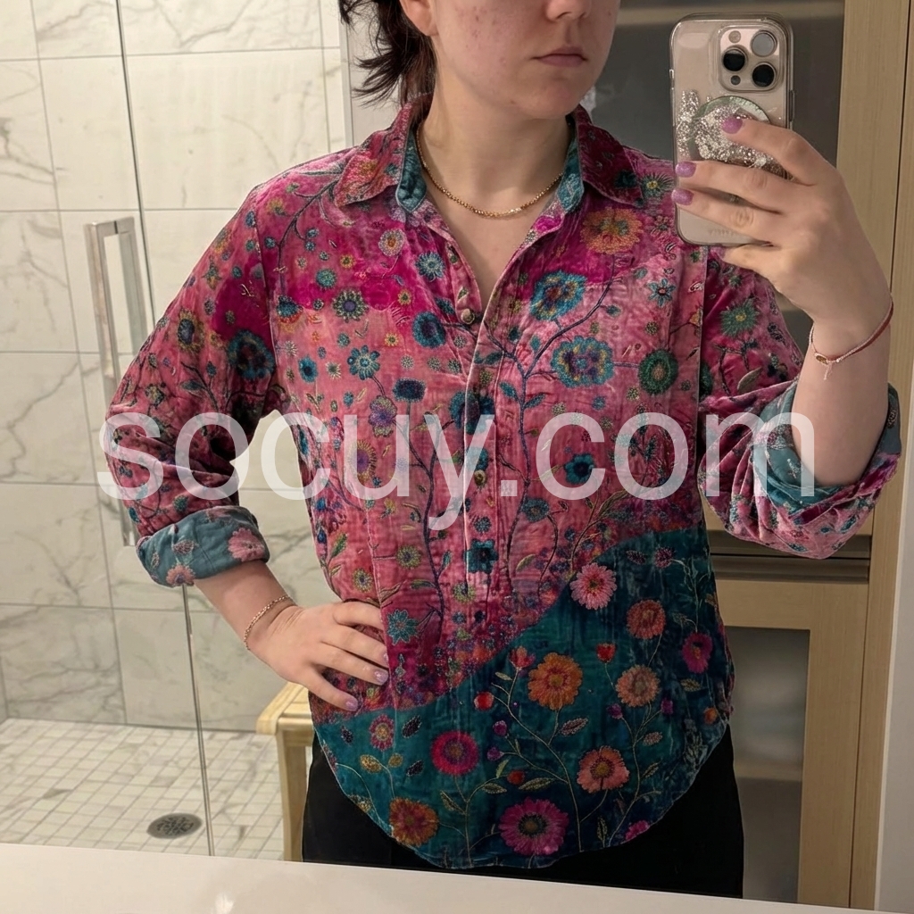 This long-sleeve shirt features a colorful floral print with a bold purple and teal color block design. The relaxed fit and classic collar offer effortless style. Perfect for pairing with jeans or denim shorts. Ideal for bohemian-inspired looks. Lightweight and eye-catching for casual days.