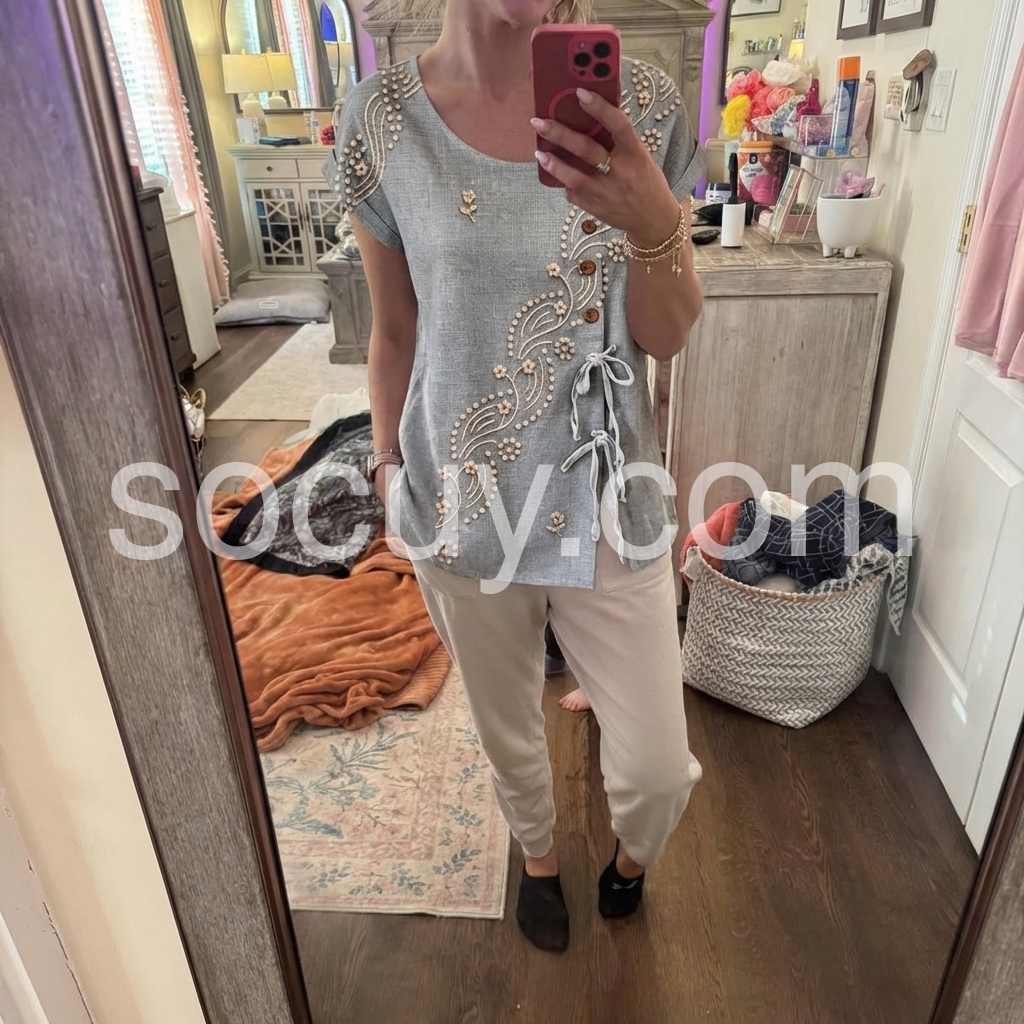 This blouse blends artisanal detail with feminine charm. The muted gray base, adorned with delicate floral and dot embroidery, evokes timeless sophistication.