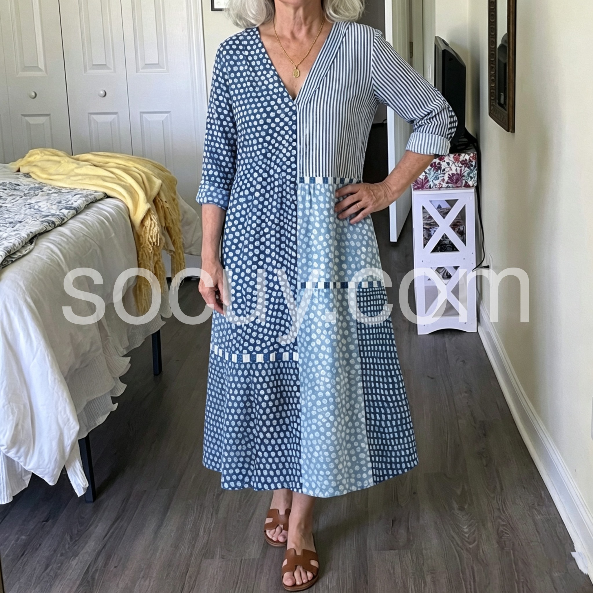 Stand out with this eye-catching blue patchwork maxi dress. The mixed polka dot, stripe and grid prints create a unique, modern look.