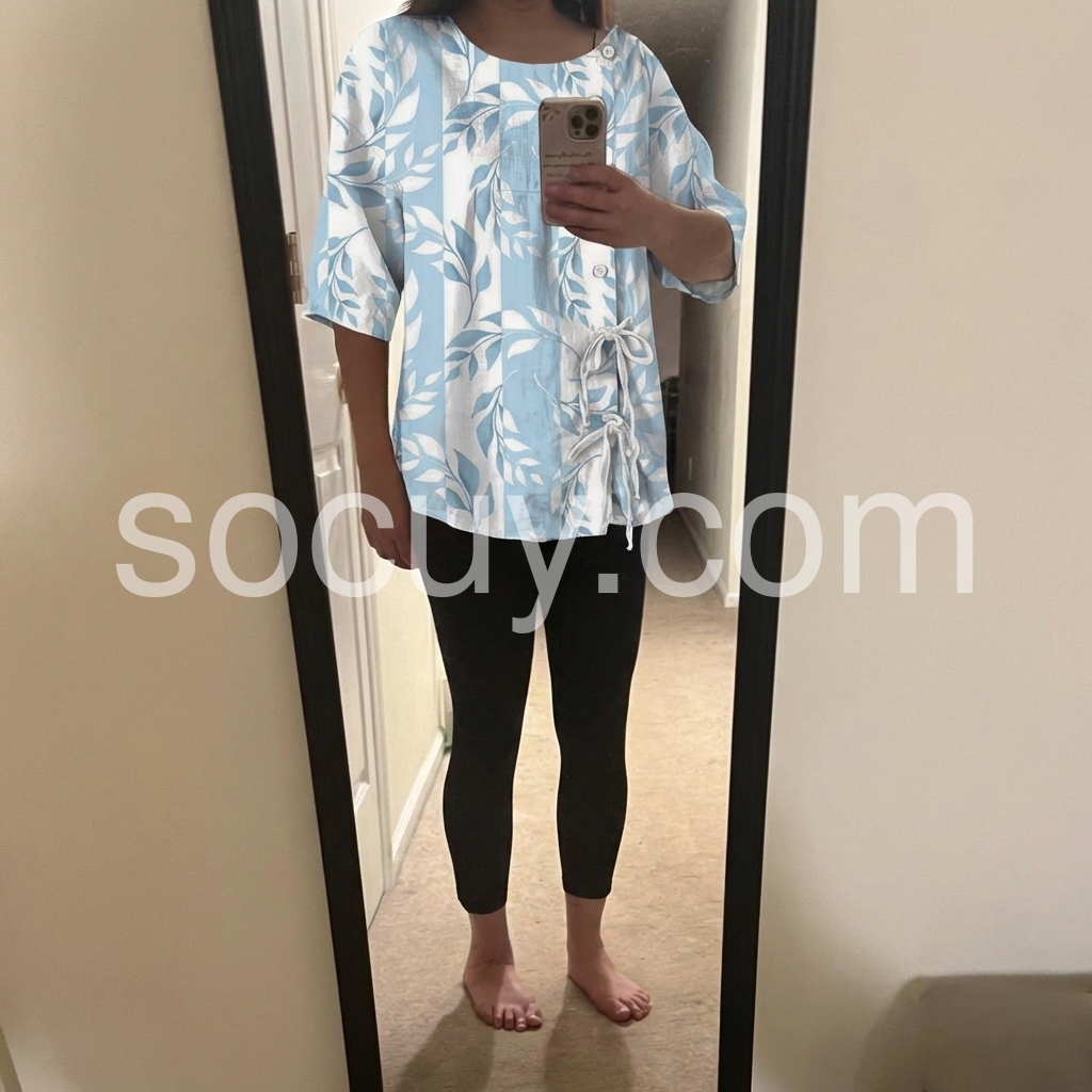 This loose-fitting top features a soft blue and white leaf pattern with vertical stripes. The front button closure and side tie add a stylish touch. Made from lightweight fabric perfect for warm days. Pair with jeans or pants for a casual, breezy look. Comfortable and effortlessly chic.