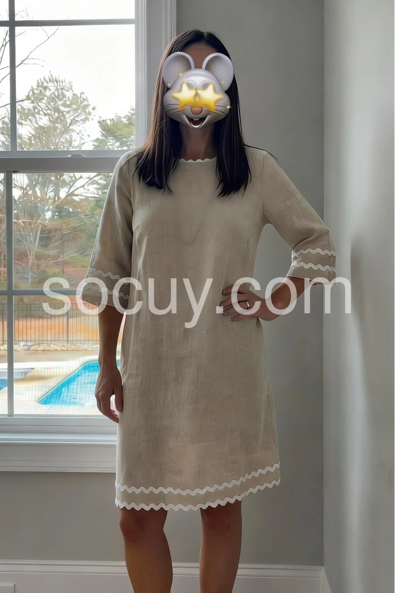 This mid-length dress features a relaxed silhouette with delicate white scalloped trim at the hem and sleeves. Made from lightweight linen for comfort and breathability. Perfect for daytime events or warm-weather occasions. Pair with pearls and heels for a polished look. Timelessly elegant and easy to wear.