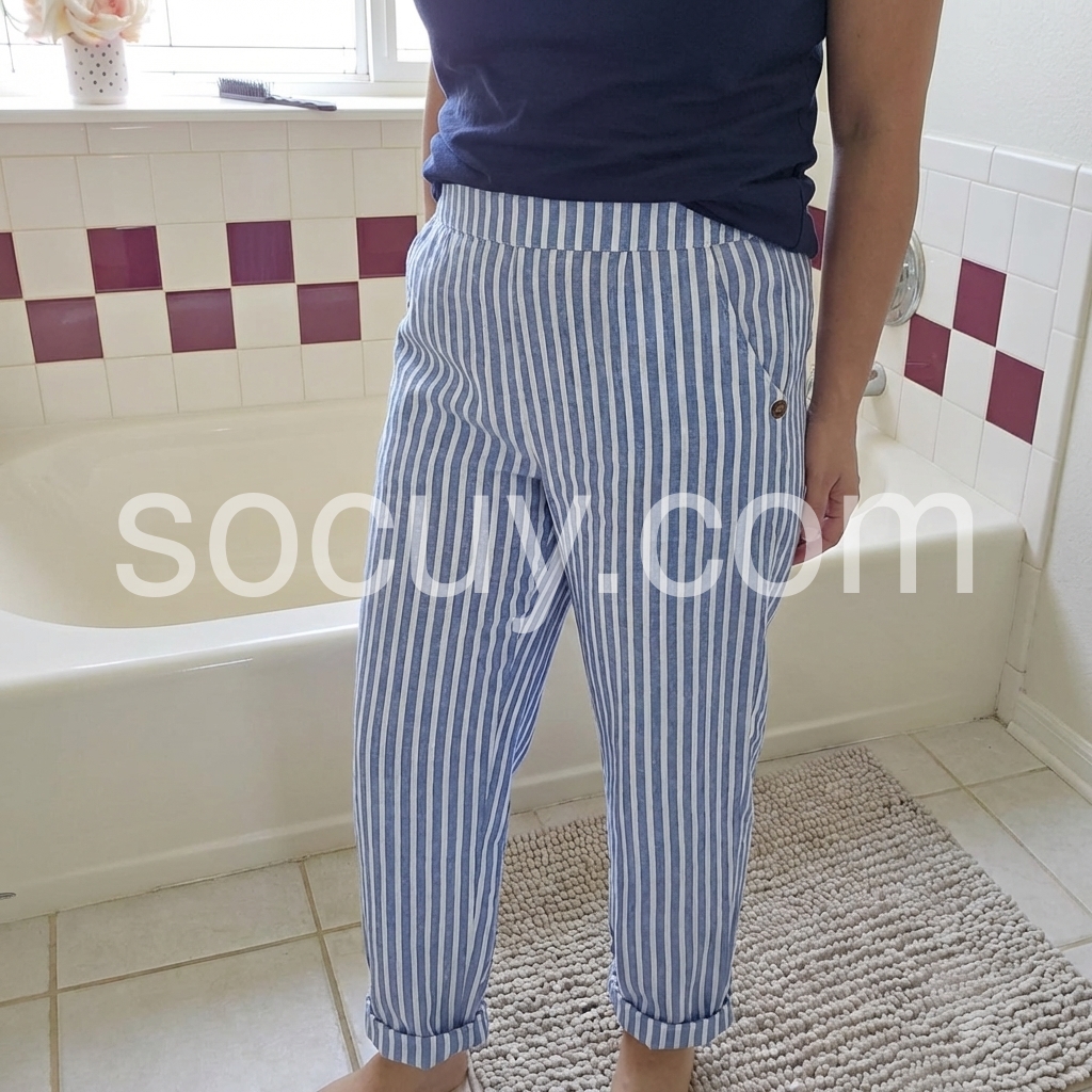 These relaxed-fit pants feature vertical blue and white stripes with a casual, breezy silhouette. Elastic waistband and side pockets for comfort. Cuffed hems add a stylish touch. Perfect for beach days or everyday wear. Lightweight fabric ideal for warm weather.
