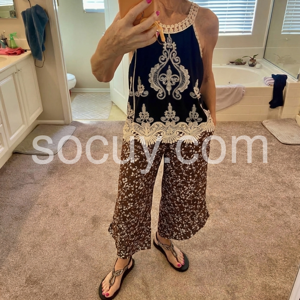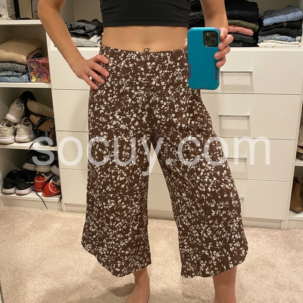 These high-waisted culottes feature a delicate white floral print on a rich brown base. Wide-leg design with an asymmetrical hem for a stylish flair. Elastic waistband for comfort and ease. Lightweight fabric perfect for warm weather. Ideal for casual outings or boho-chic looks.