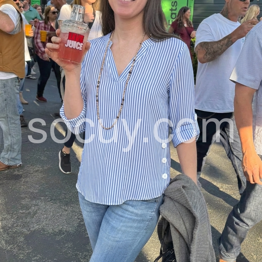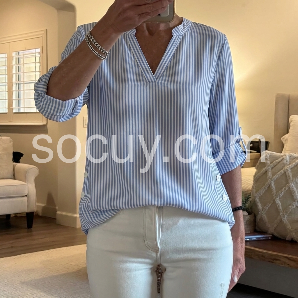 This elegant top features vertical blue and white stripes with a soft V-neckline. Side buttons add a stylish detail. Three-quarter sleeves with rolled cuffs for comfort. Lightweight fabric perfect for casual or office wear. Effortlessly chic and breathable.