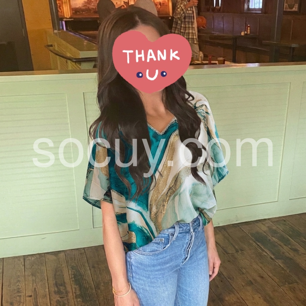 This loose-fitting top features a bold emerald, gold, and cream abstract design. V-neckline with delicate trim for added detail. Wide sleeves and relaxed silhouette for effortless comfort. Perfect for warm days or beachwear. Stylish and easy to pair with pants or shorts.