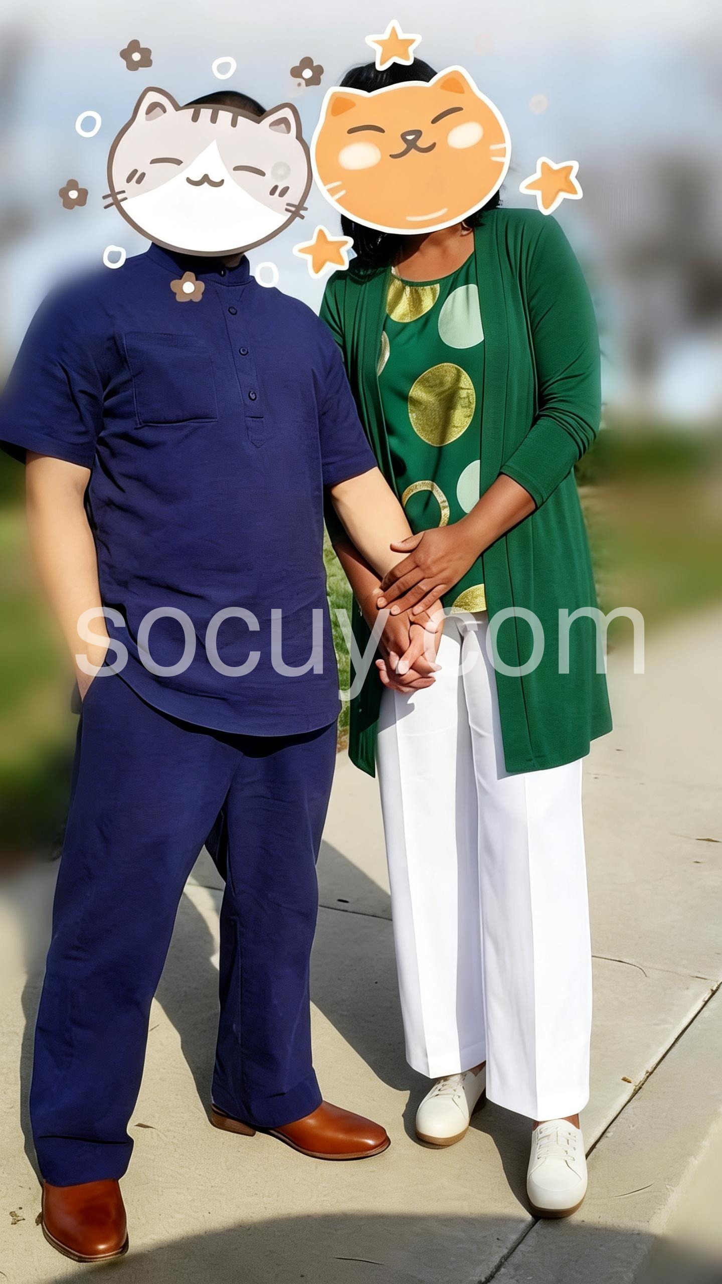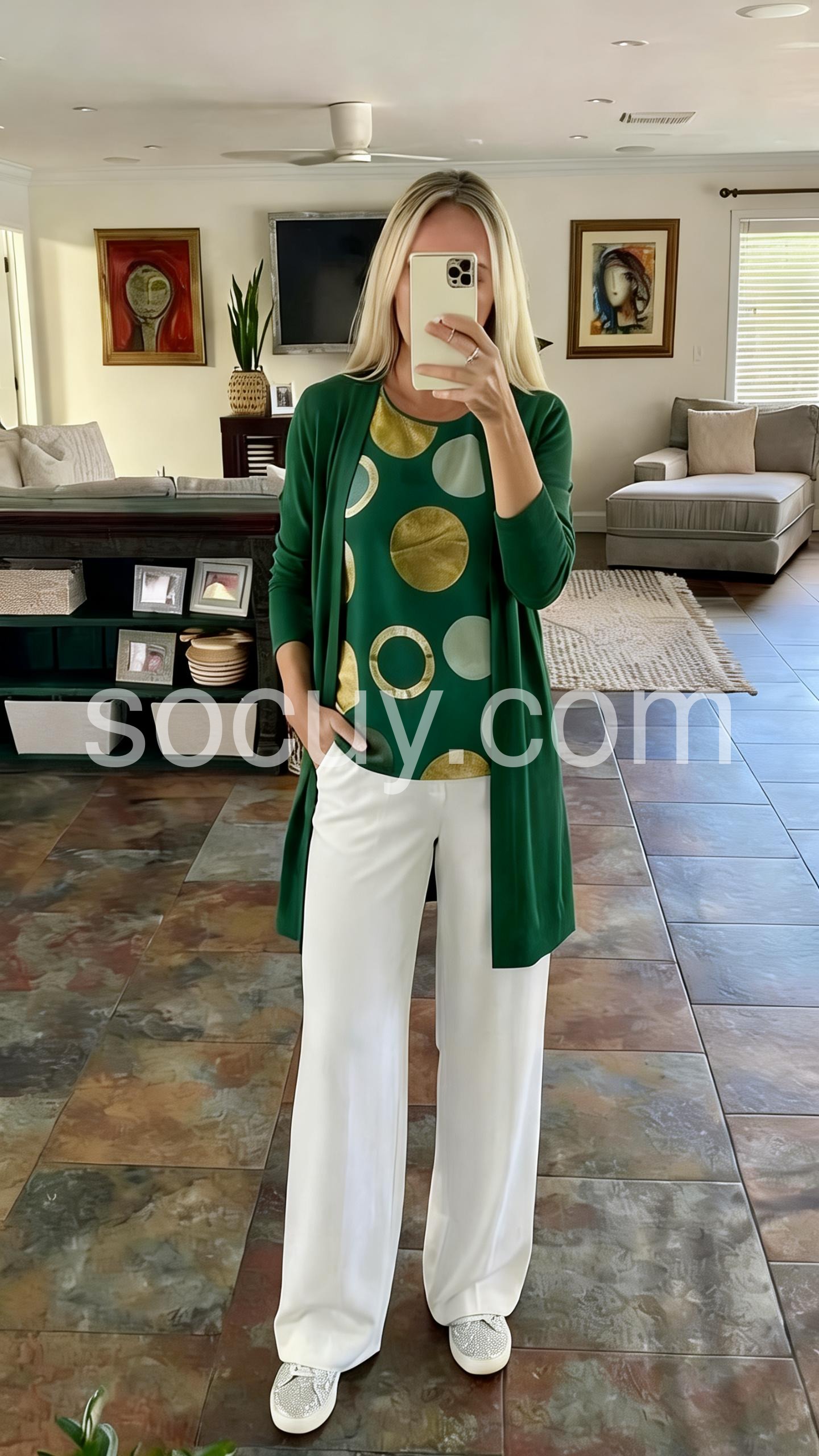 This three-piece look features a green top with gold and white circle print, paired with crisp white wide-leg pants. A matching long cardigan adds elegance and layering. Perfect for spring or summer days. Effortlessly chic and comfortable for any occasion.