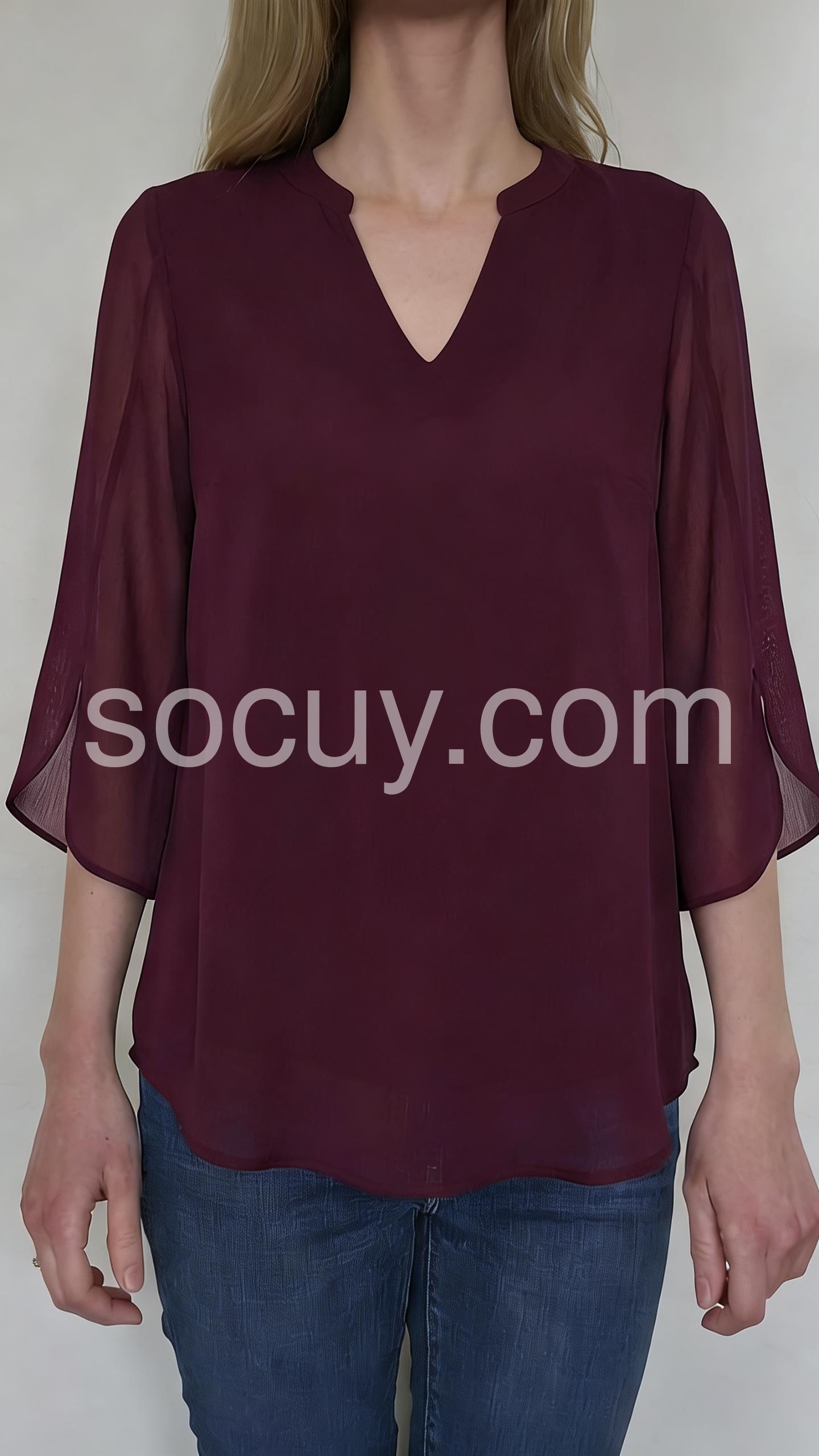 This V-neck blouse features a lightweight, sheer chiffon fabric with a soft drape. The three-quarter flutter sleeves add a feminine touch. Perfect for pairing with pants or jeans. Ideal for casual outings or dressy occasions. Effortlessly stylish and comfortable.