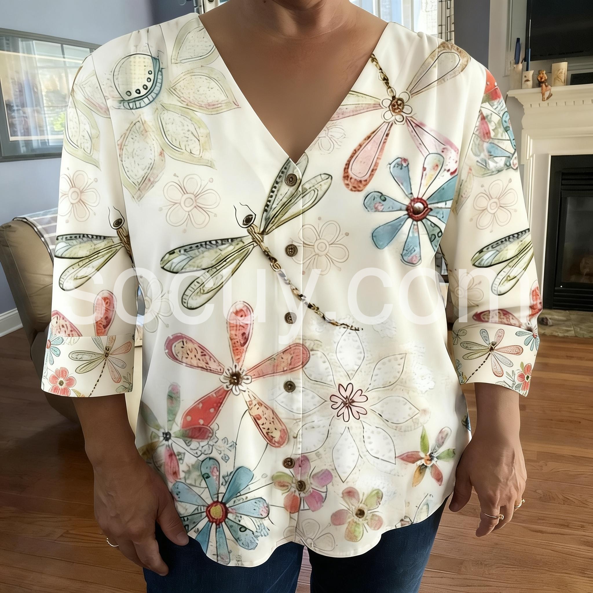 This V-neck top features a vibrant floral and dragonfly print on a soft cream base. Front button closure with rolled three-quarter sleeves. Lightweight fabric perfect for warm days. Relaxed fit with a playful, artistic touch. Ideal for casual outings or beachwear.