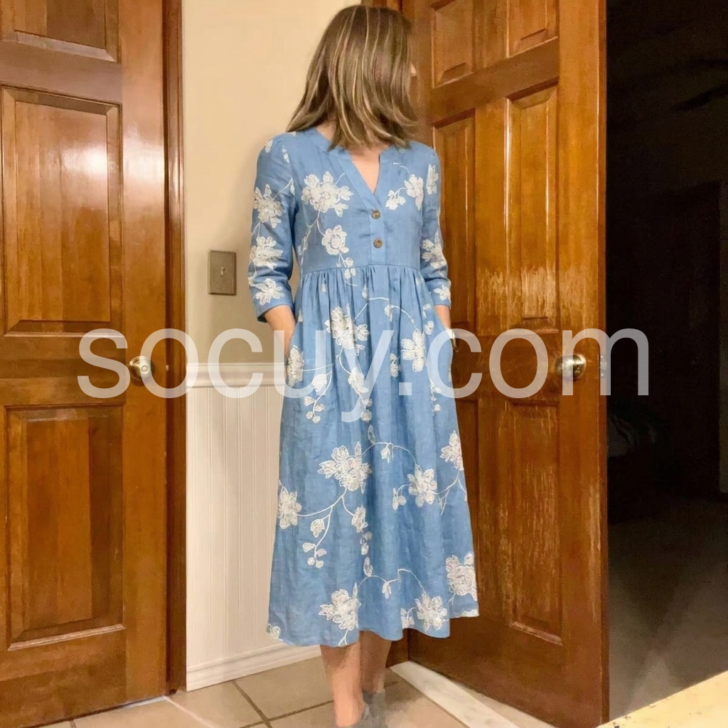 Crafted to solve the "plain linen dress" pain point, this dress is adorned with intricate floral embroidery that adds artistry to everyday wear. The V-neck flatters the bust, while the pleated waist cinches without squeezing.