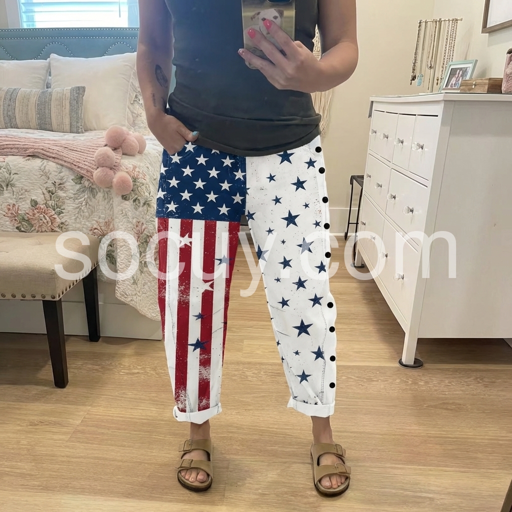 These loose-fit pants feature a bold American flag print with stars and stripes on one leg. Side button details add a unique touch. Elastic waistband and cuffed hems for comfort. Lightweight fabric perfect for casual wear. Ideal for summer outings or festive occasions.
