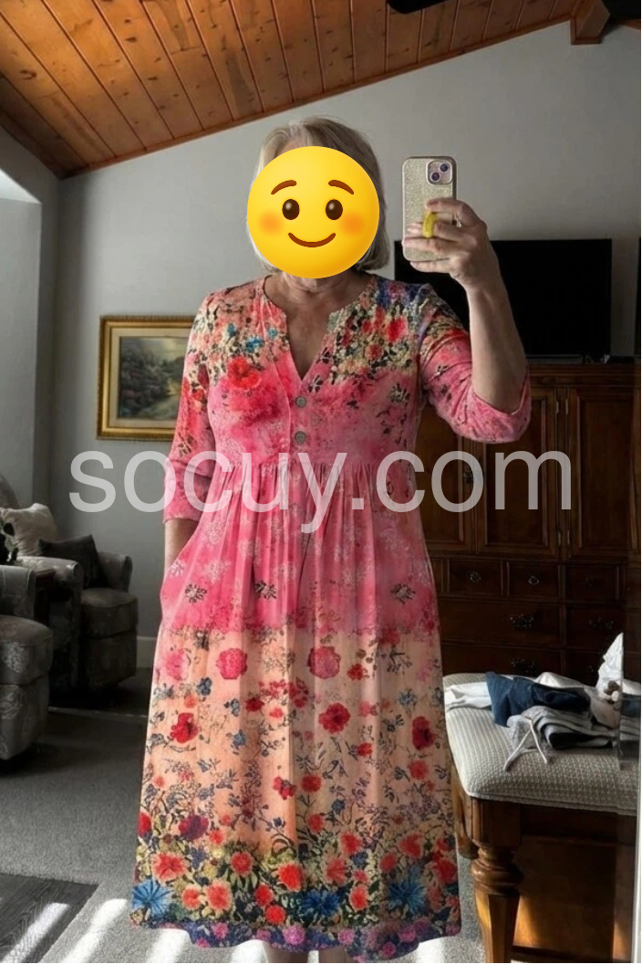 This midi dress features a vibrant floral print with a soft pink gradient and bold blooms. The V-neckline and three-quarter sleeves offer a flattering, relaxed fit. Side pockets add practicality and ease. Flowy A-line silhouette enhances movement. Perfect for garden parties or casual summer days.