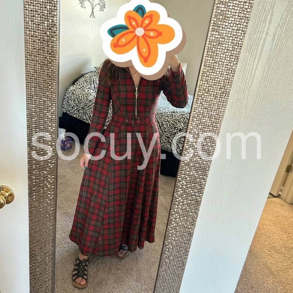 I bought this dress for a special occasion, and it exceeded my expectations. The plaid pattern is bold and stylish, and the long sleeves add a sophisticated touch. The seams and fit look carefully designed, especially around the waist where the belt sits nicely. Even after hours of wear, it feels comfortable and breathable. It instantly made me feel confident and chic.