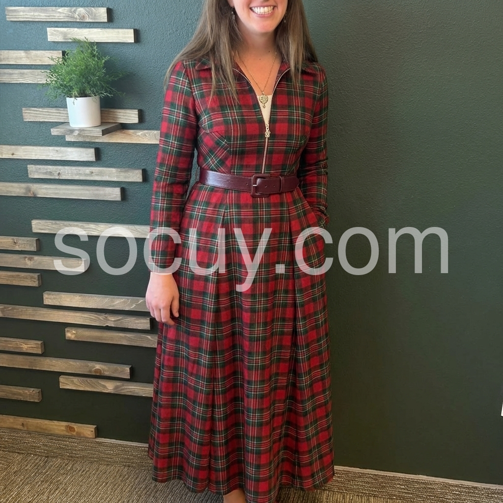 Elevate your wardrobe with this striking red plaid maxi dress, designed for those who appreciate timeless style with contemporary flair. The full-length silhouette offers sophisticated coverage, while the zip front closure provides effortless dressing and versatile styling options. Long sleeves deliver warmth and elegance, making this piece ideal for layering or wearing solo across seasons. The classic plaid pattern adds visual interest and pairs seamlessly with boots, sneakers, or heels depending on the occasion. Perfect for casual outings, professional settings, or weekend gatherings, this dress combines comfort with refined aesthetics for a polished everyday look.