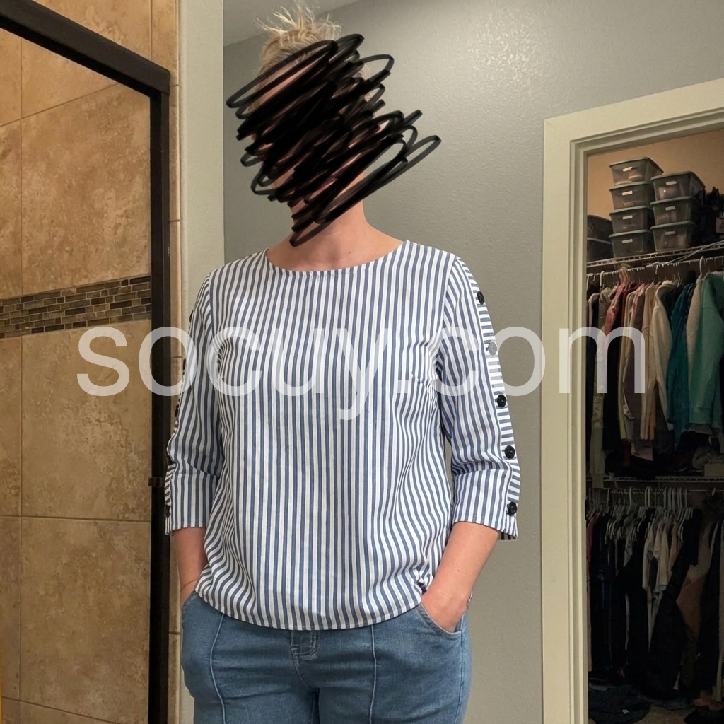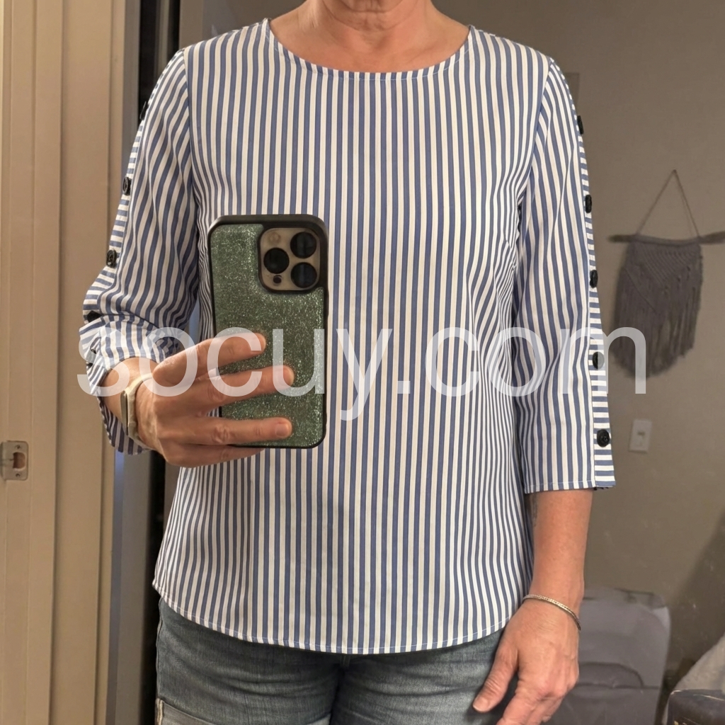 Effortless elegance meets everyday comfort in this timeless striped essential. The crisp vertical blue and white stripes create a flattering, elongating effect, while the relaxed boxy silhouette offers freedom of movement without sacrificing polish. Three-quarter sleeves with subtle side button details add a contemporary edge—a small touch that elevates the entire look. Crafted from a breathable cotton-elastane blend, this lightweight top drapes beautifully and moves with you throughout your day. The rounded neckline keeps things understated and versatile, making it the perfect canvas for layering or standalone styling. Transition seamlessly from weekend brunch to office meetings, paired with tailored trousers or your favorite denim. Machine washable for effortless care. This is the top you'll reach for again and again—the one that makes getting dressed feel like second nature.