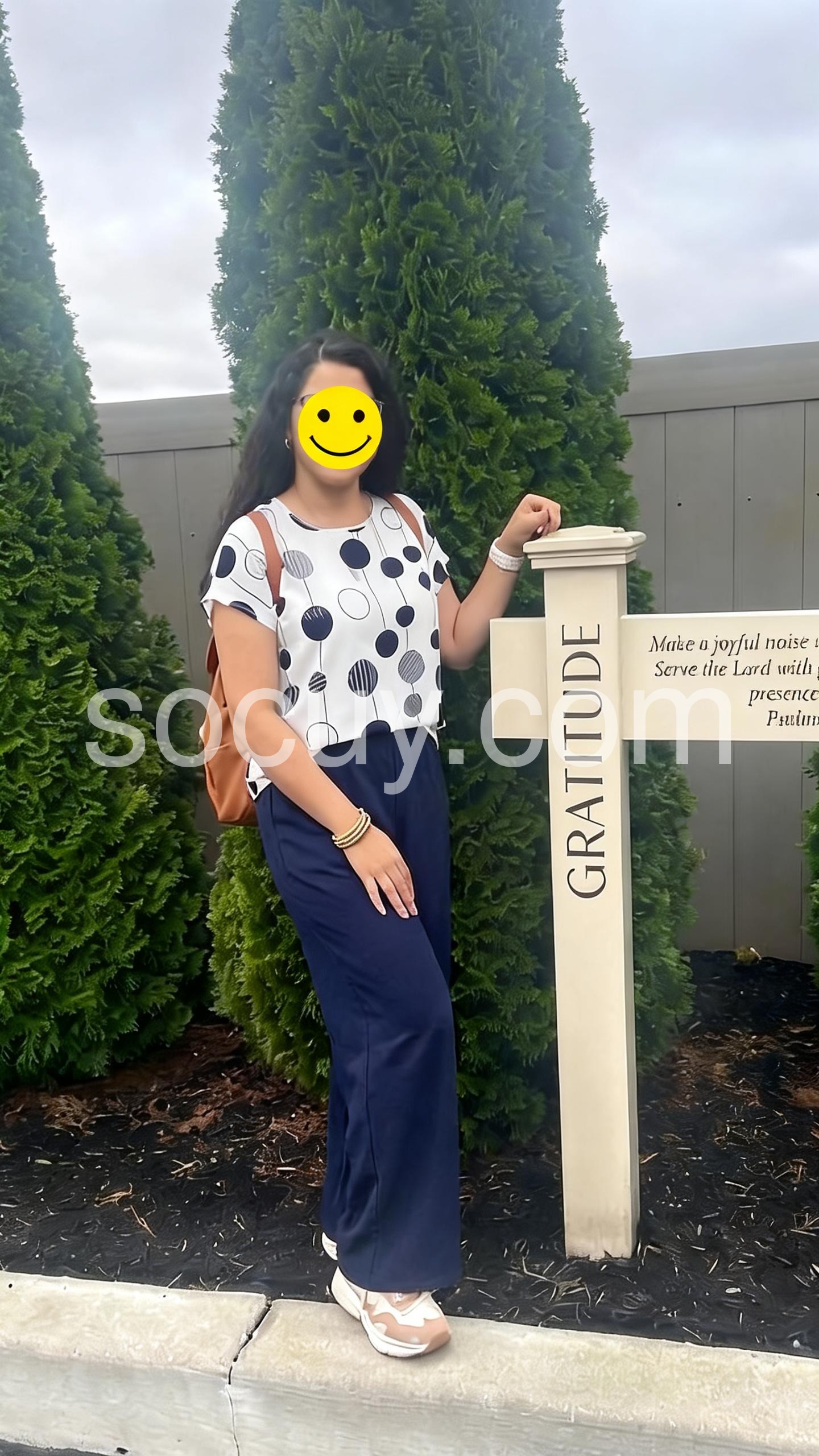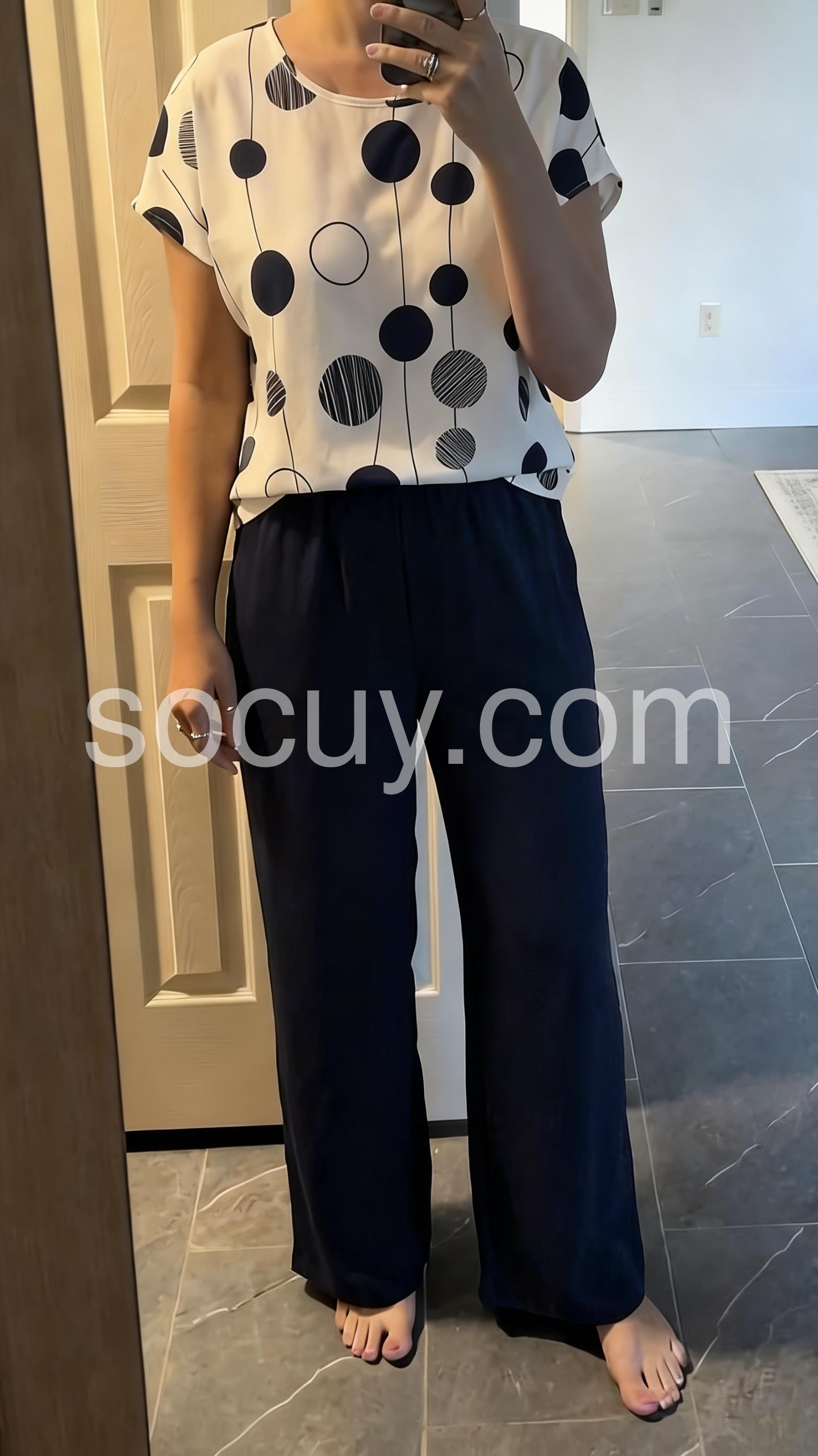 This coordinated outfit features a white top with abstract navy polka dots and relaxed fit. Paired with high-waisted, wide-leg navy pants for a chic silhouette. Lightweight and comfortable for everyday wear. Perfect for casual outings or warm-weather style. Effortlessly stylish with a minimalist touch.