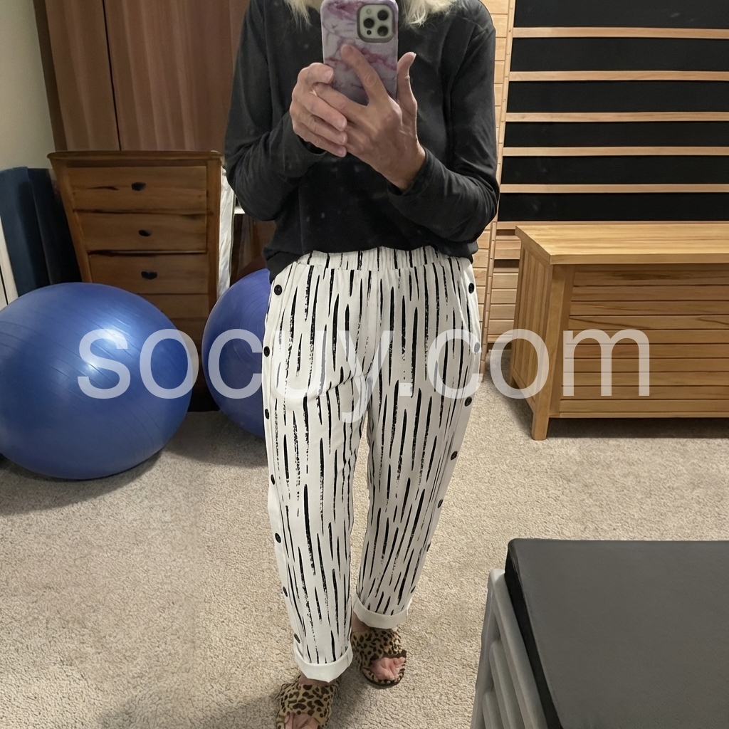 These relaxed-fit pants feature a bold black abstract stripe print on a white base. Elastic waistband and cuffed hems offer a cozy, stylish look. Side button details add a unique touch. Lightweight fabric perfect for casual wear. Effortlessly chic with a contemporary edge.