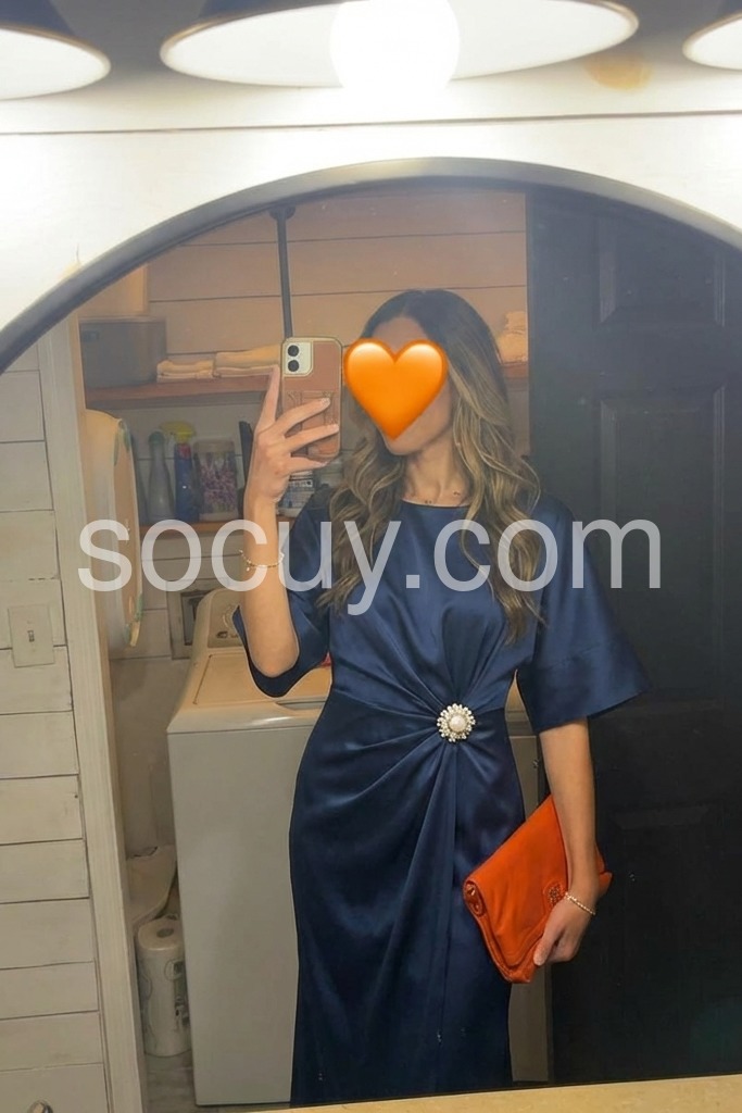 Elevate your wardrobe with this sophisticated navy satin midi dress, designed for the discerning woman who values timeless elegance. The flowing cape sleeves add a dramatic yet refined silhouette, while the luxurious satin fabric drapes beautifully against the body. Perfect for evening events, formal occasions, or elevated everyday wear, this versatile piece transitions seamlessly from day to night. The midi length offers a modern take on classic sophistication, providing both coverage and movement. A wardrobe essential that combines understated luxury with contemporary design.