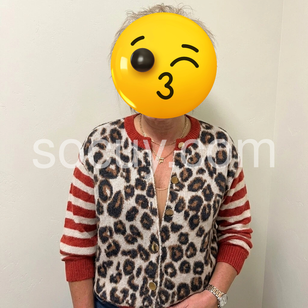 The fit is great—comfortable through the body without feeling bulky. The neckline and button placement look nice, and the leopard pattern is super cute. Soft knit and great quality.