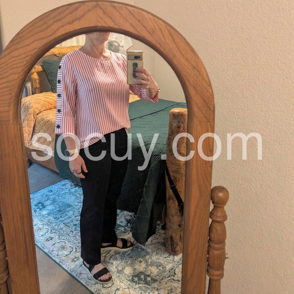 his loose-fit top features vertical pink and white stripes with stylish button details on the sleeves. Three-quarter sleeves with rolled cuffs offer a relaxed look. Round neckline for a clean, comfortable fit. Perfect for casual wear or smart-casual outfits. Bright and cheerful with a touch of elegance.