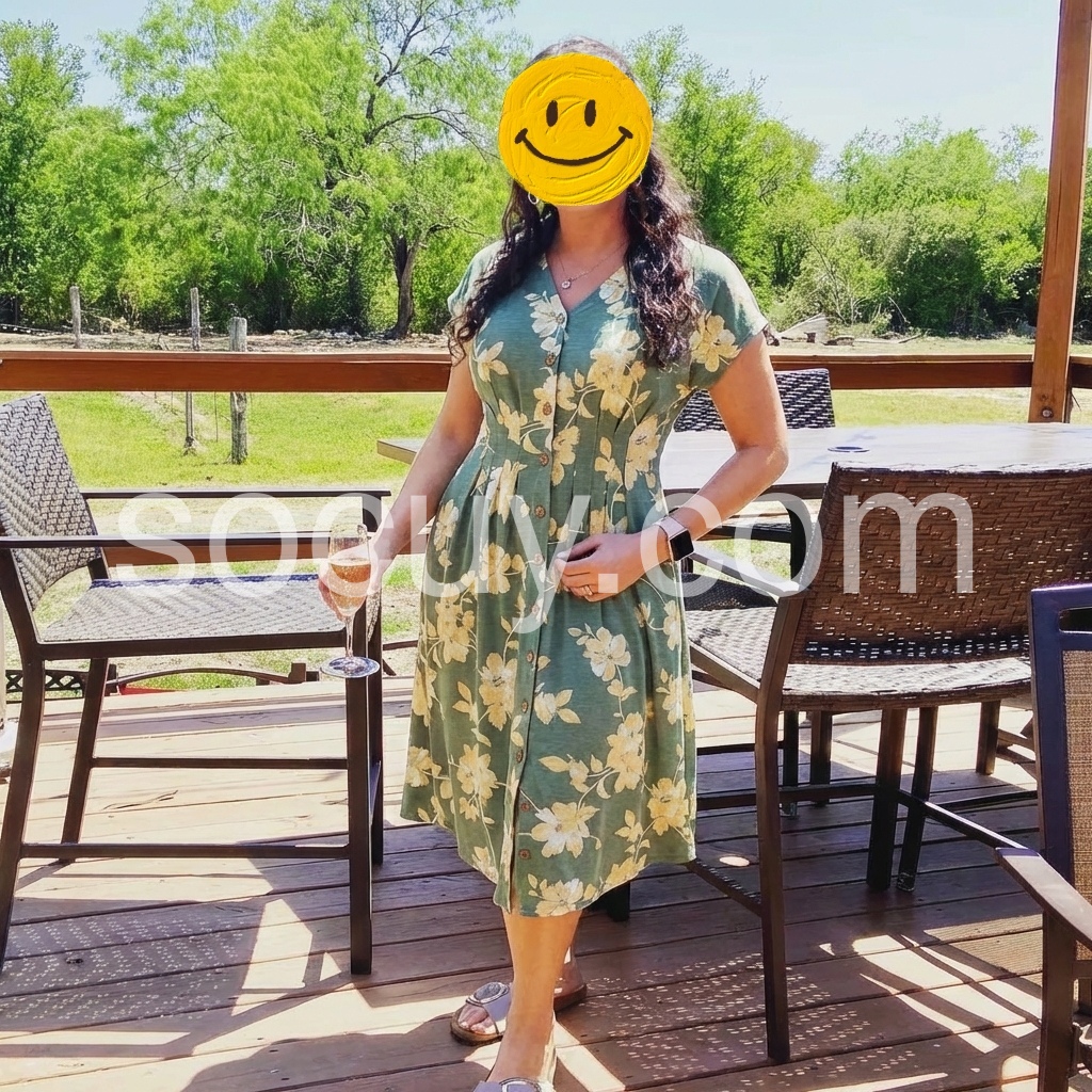 Crafted to solve the "frumpy summer dress" pain point, this dress features a muted green base and golden florals for timeless elegance. The V-neck flatters the bust, while the pleated waist cinches without squeezing.