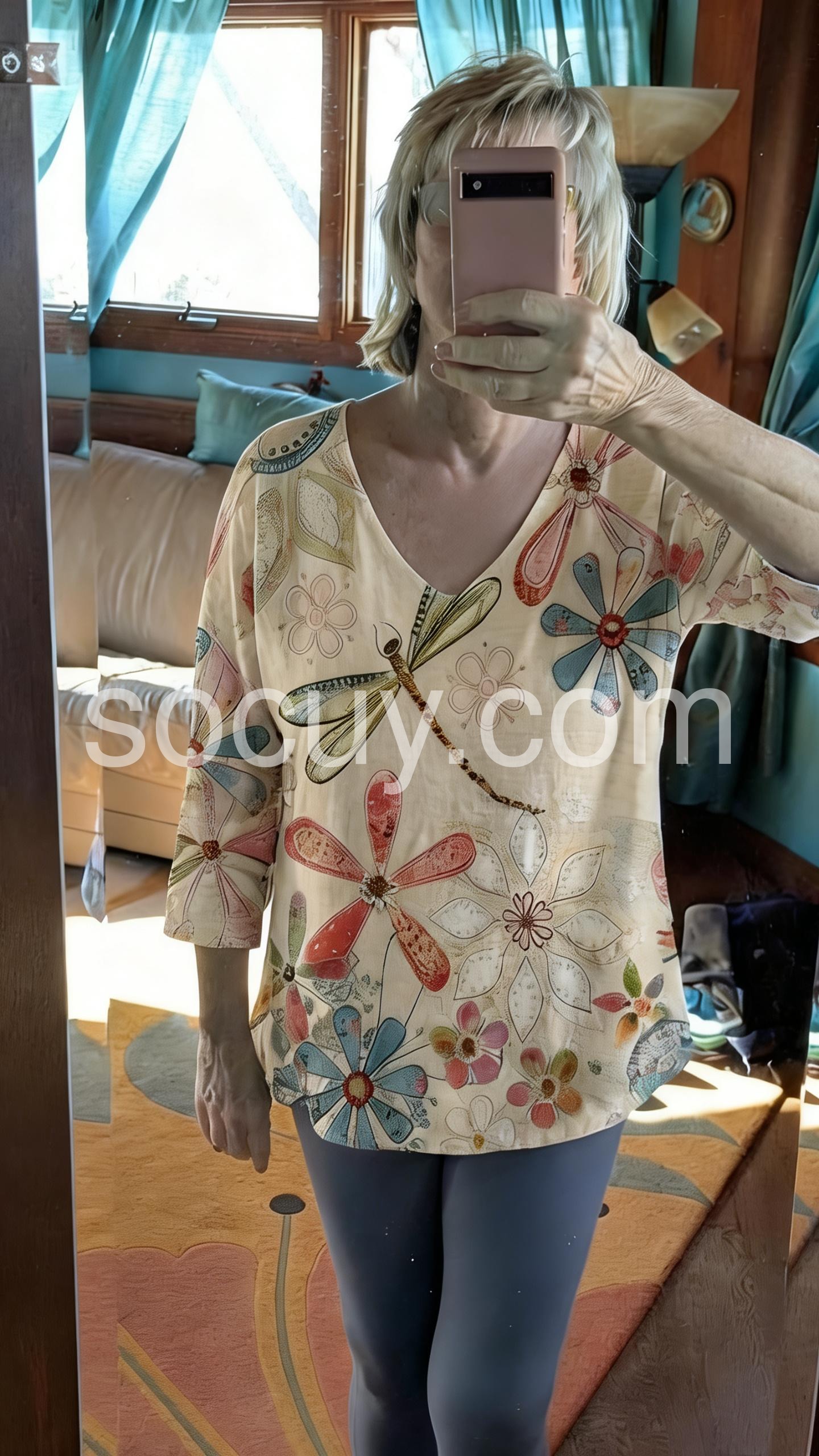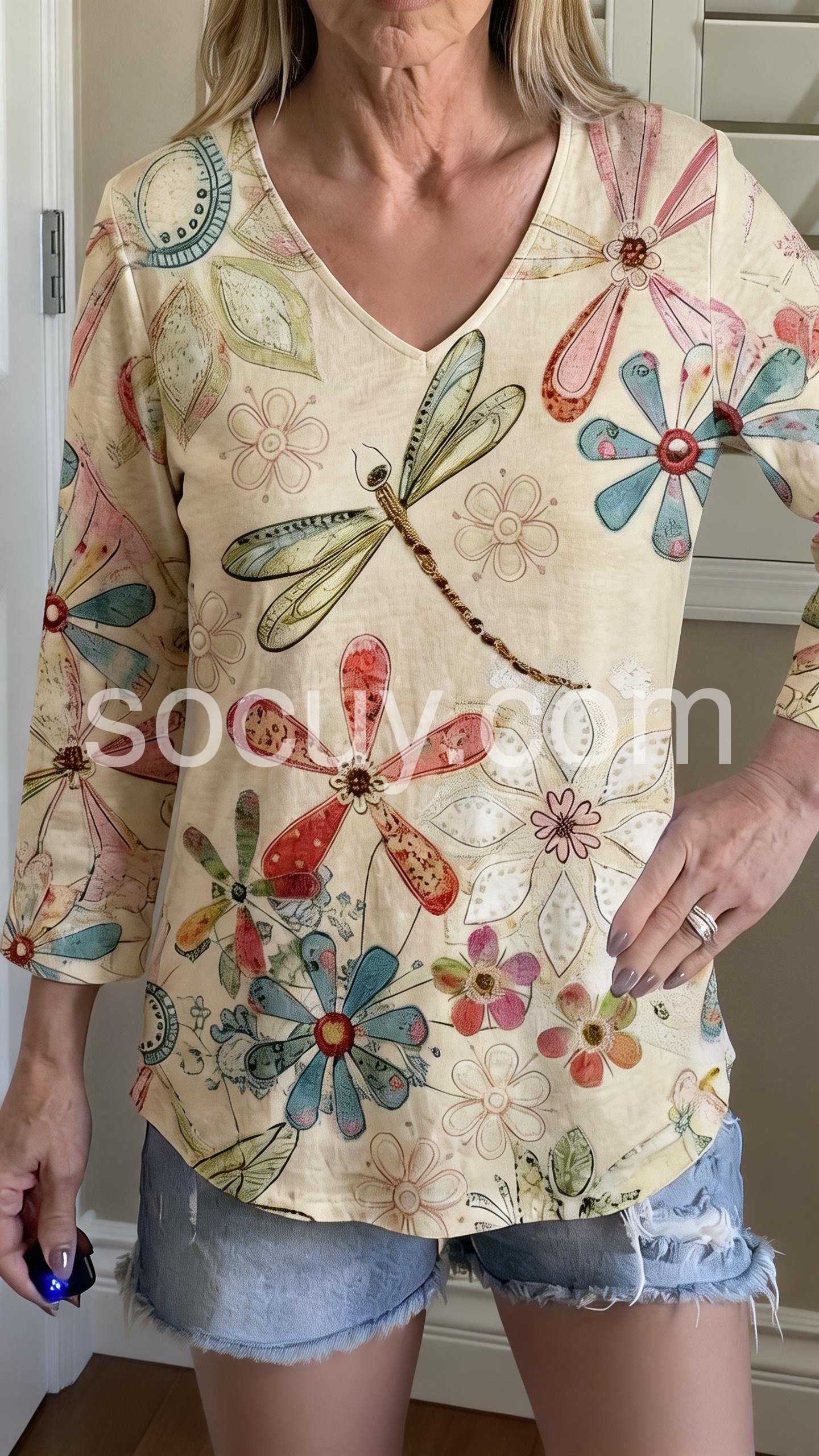 This loose-fitting top features a charming floral and dragonfly print on a soft cream base. With a deep V-neck. Perfect for casual days or bohemian style. Pair with white pants for a fresh, airy vibe. Light, artistic, and full of nature-inspired charm.