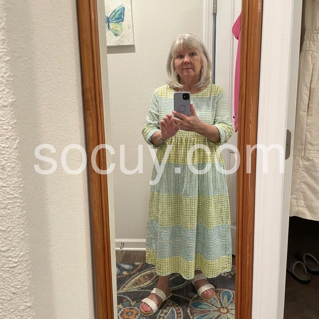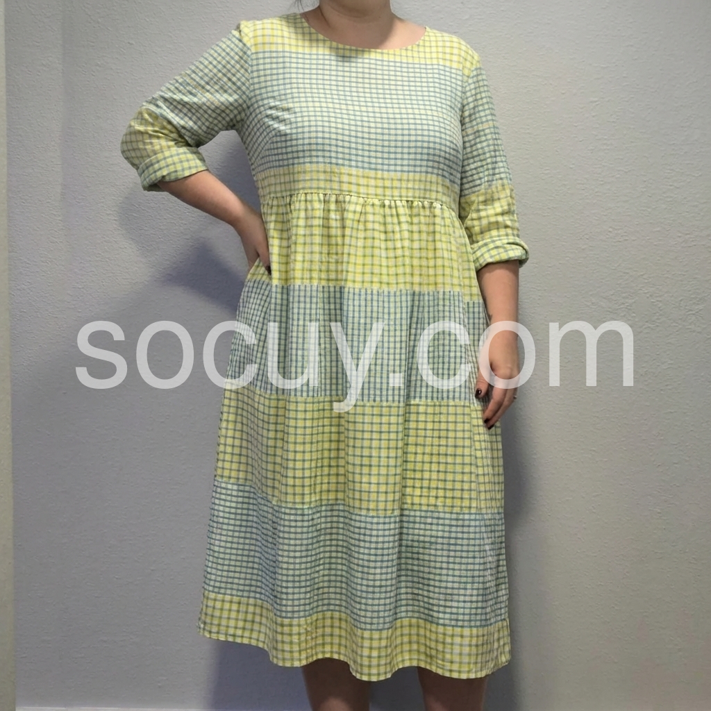 This midi dress celebrates effortless summer style with a playful color-block gingham design. The round neck, 3/4 sleeves, and tiered skirt offer a relaxed, flowy fit.