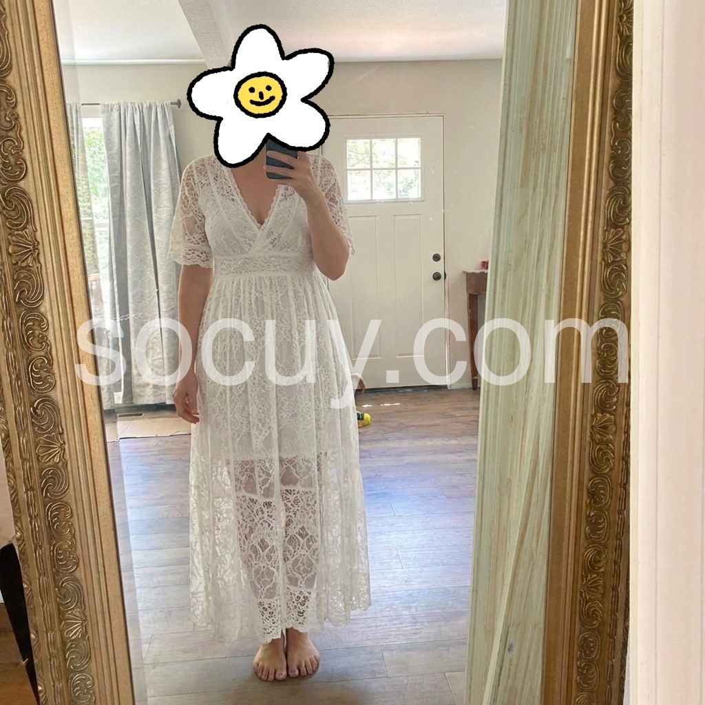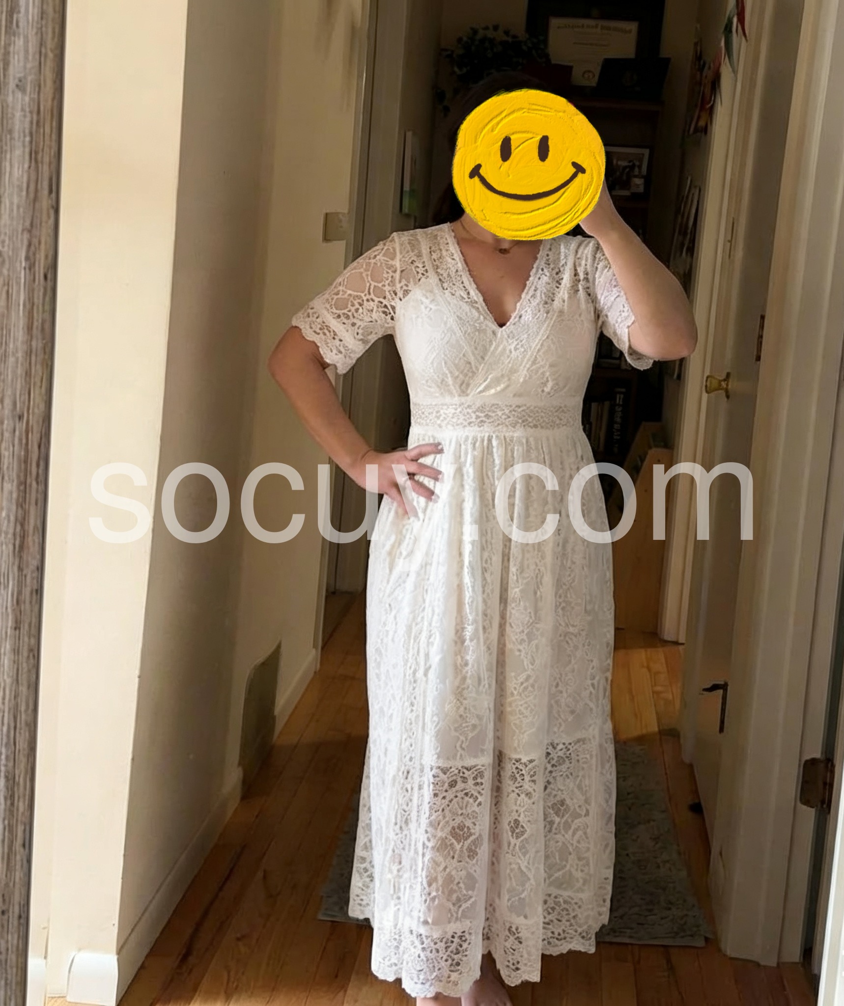 The intricate white lace, V-neckline, and cinched waist create a dreamy, feminine silhouette, with pockets for everyday ease.
