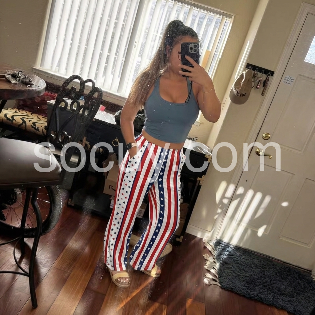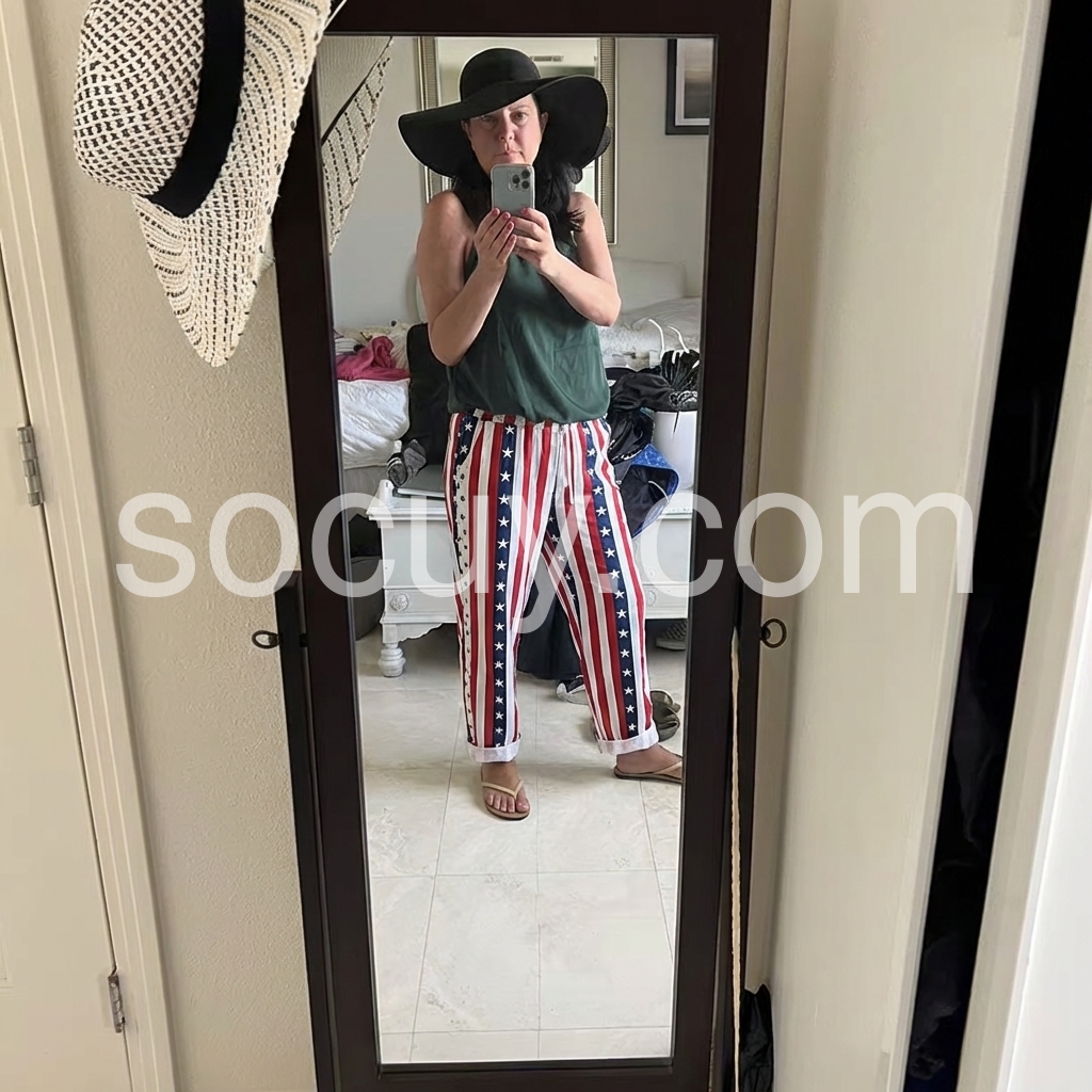 These relaxed-fit pants feature a bold red, white, and blue flag design. Elastic waist with drawstring for comfort. Cuffed hems and side pockets add practicality. Lightweight fabric perfect for warm weather. Ideal for festive occasions or casual wear.