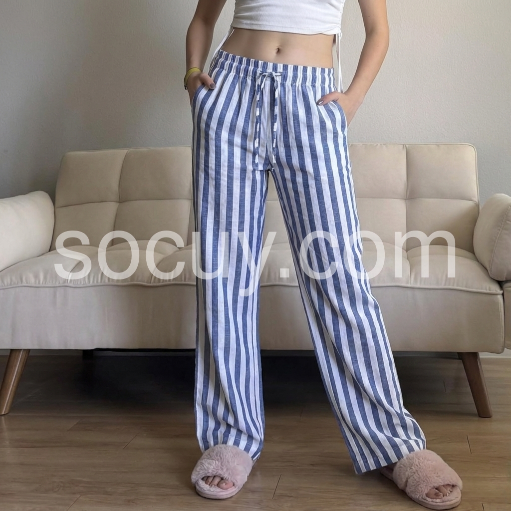 These relaxed-fit pants feature bold vertical stripes in navy and white. Elastic waistband with drawstring for comfort. Wide-leg design and lightweight fabric perfect for summer. Ideal for beach outings or casual wear. Effortlessly stylish and breezy.