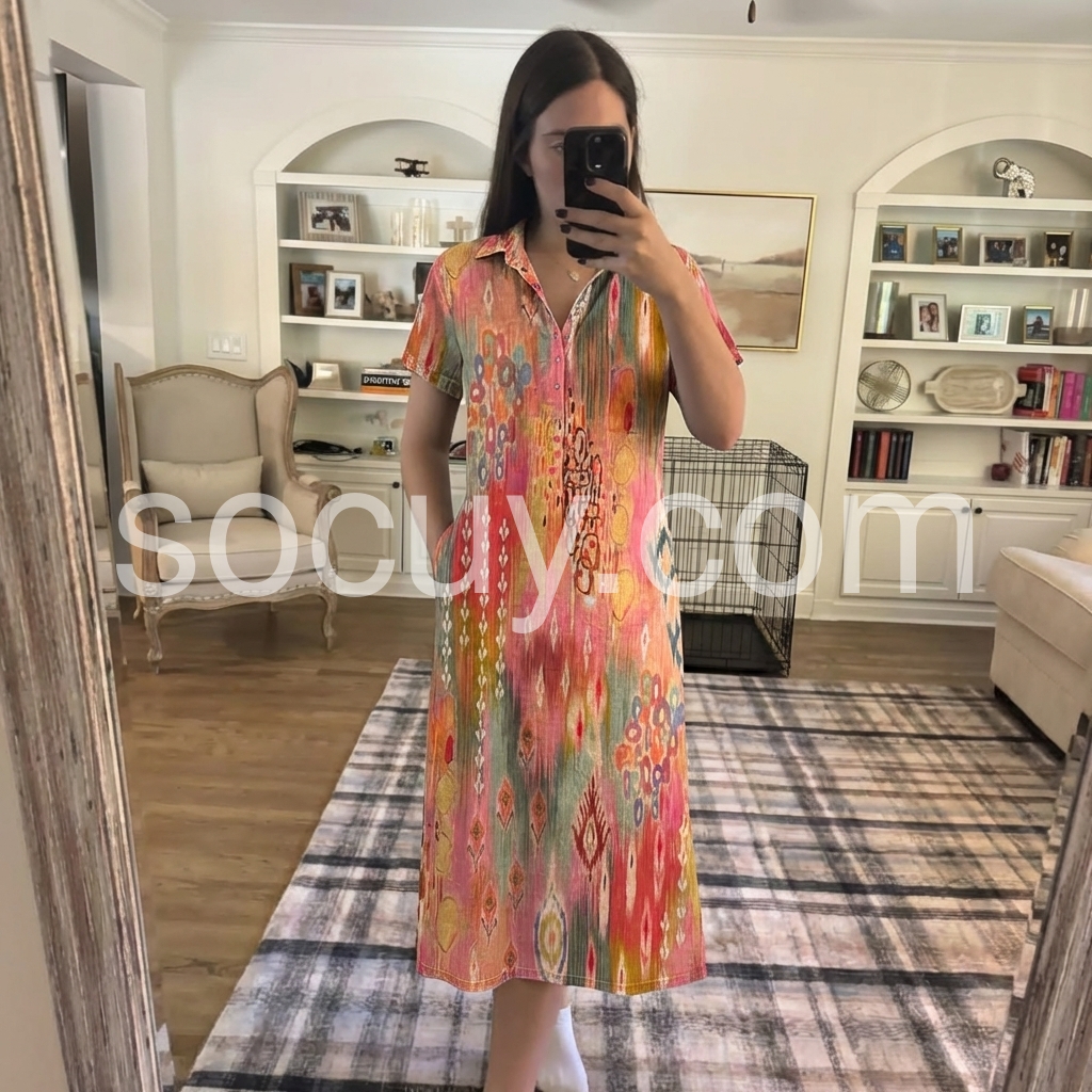 This mid-length shirt dress features a bold ikat pattern in warm reds, pinks, and earthy tones. With short sleeves, a button-down front, and relaxed fit for comfort. Perfect for summer days or casual outings. Pair with sandals for a laid-back, stylish look. Effortlessly elegant with global flair.