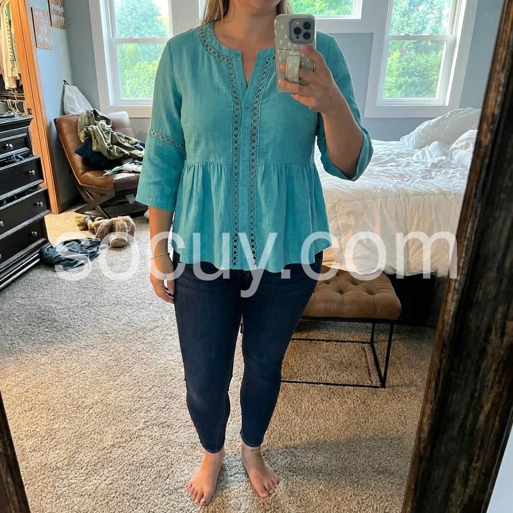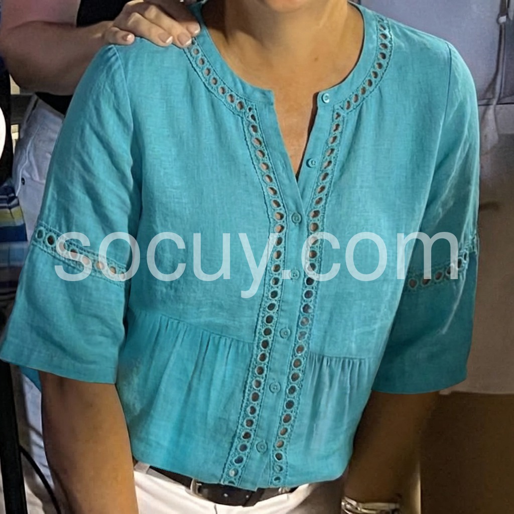 This loose-fit top features a vibrant teal hue with delicate eyelet cutouts along the neckline and sleeves. Button-down front and flared hem add a feminine touch. Three-quarter sleeves offer comfort and style. Lightweight fabric perfect for warm weather. Effortlessly chic with a relaxed, bohemian vibe.