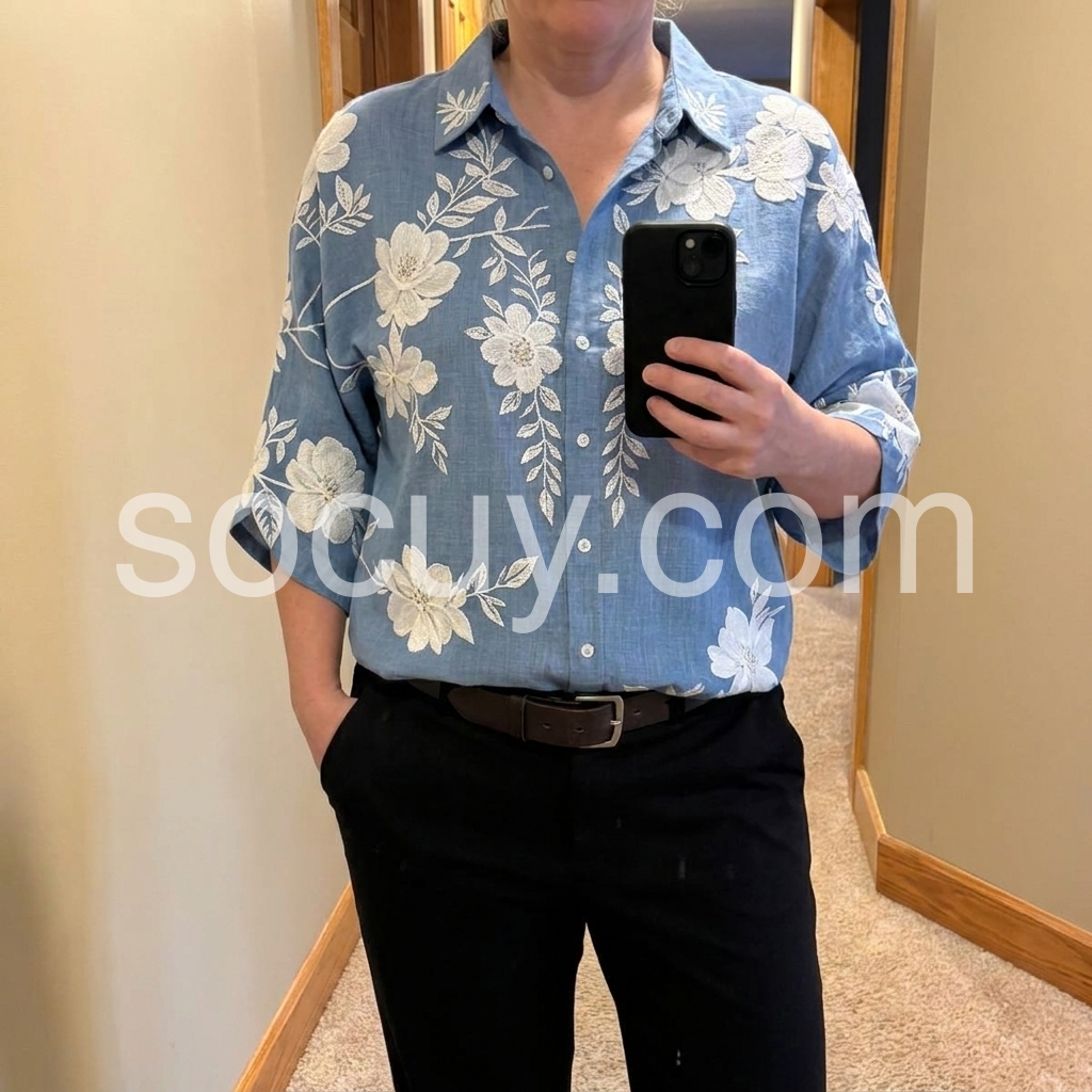 The lightweight, textured fabric is soft and breathable, solving the common problem of stiff, scratchy button-downs. The embroidery adds visual interest without feeling too busy, and the oversized fit is flattering on every body type. The curved hemline adds a relaxed touch, making it easy to tuck in or leave out.