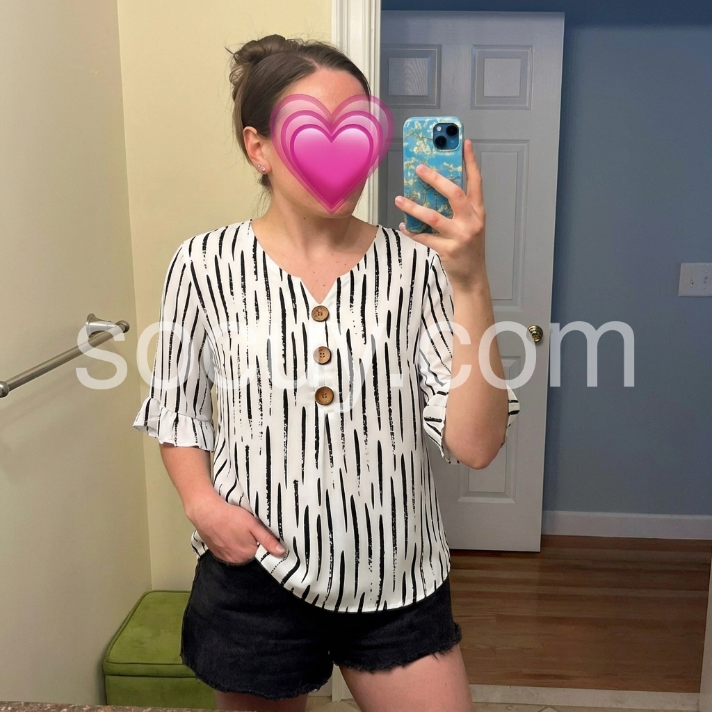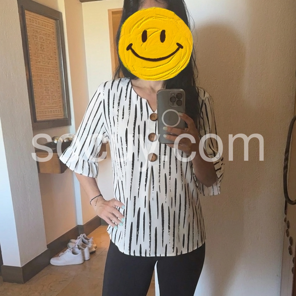 This loose-fitting top features a bold black abstract stripe print on white. V-neckline with wooden buttons down the front. Three-quarter sleeves with ruffled cuffs for a feminine touch. Lightweight and breathable, perfect for casual wear. Easy to pair with jeans or pants.