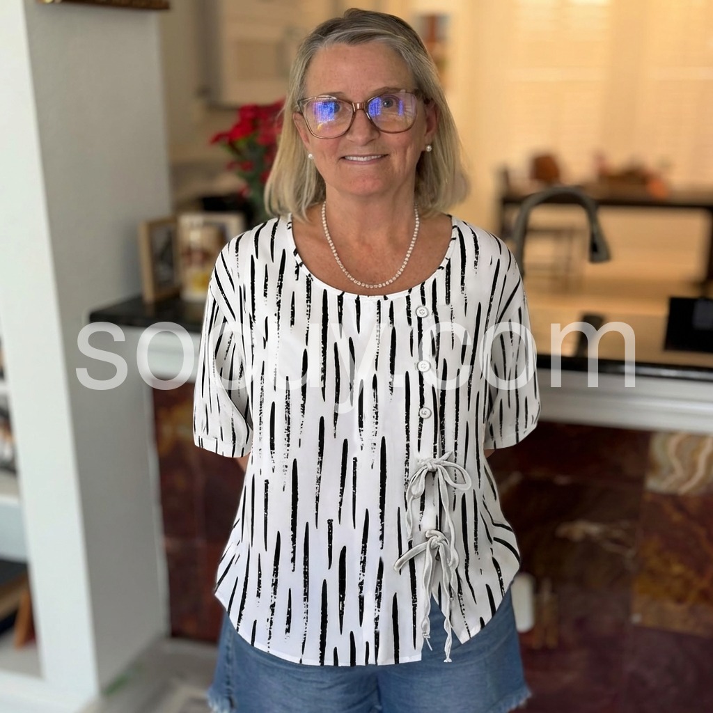 This relaxed-fit blouse features a bold black abstract stripe print on a white base. Round neckline with front button closure and side tie details. Lightweight fabric perfect for everyday wear. Ideal for pairing with jeans or leggings.