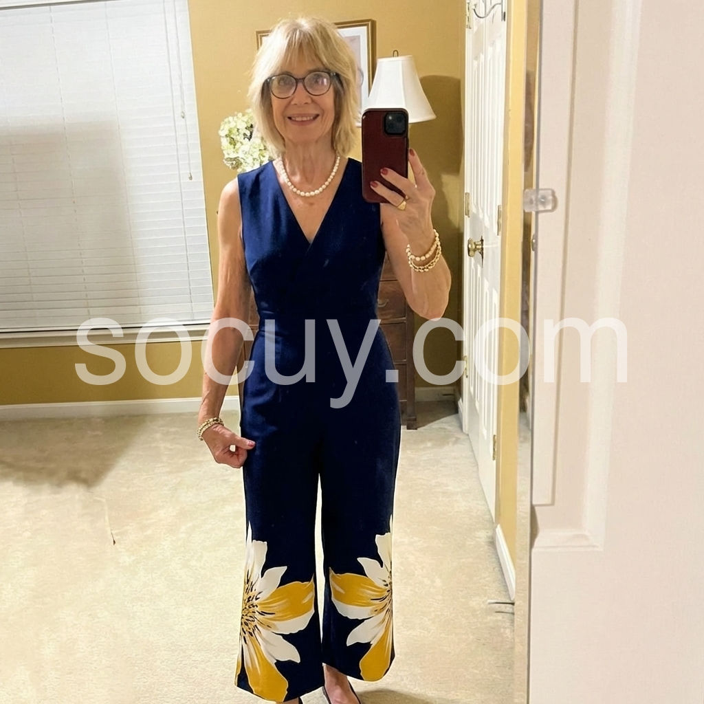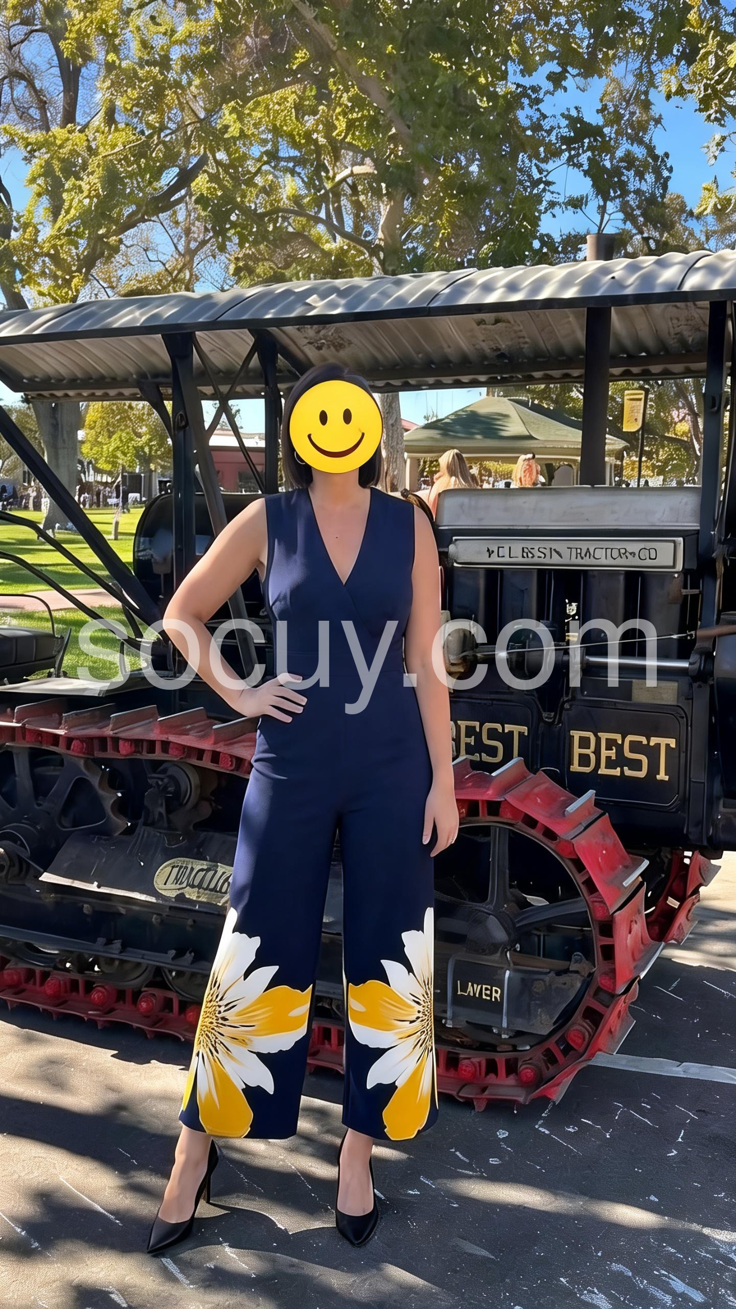 This sleeveless jumpsuit features a deep V-neckline and a fitted silhouette that flatters the figure. The wide-leg, cropped pants are accented with bold white and yellow floral prints at the hem. Made from smooth, stretchy fabric for comfort and elegance. Perfect for stylish outings or semi-formal events. Effortlessly chic with a touch of artistic flair.