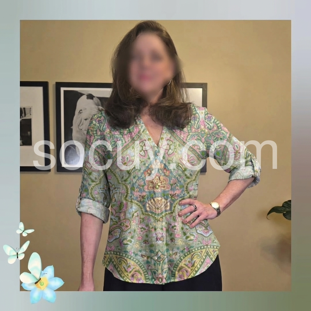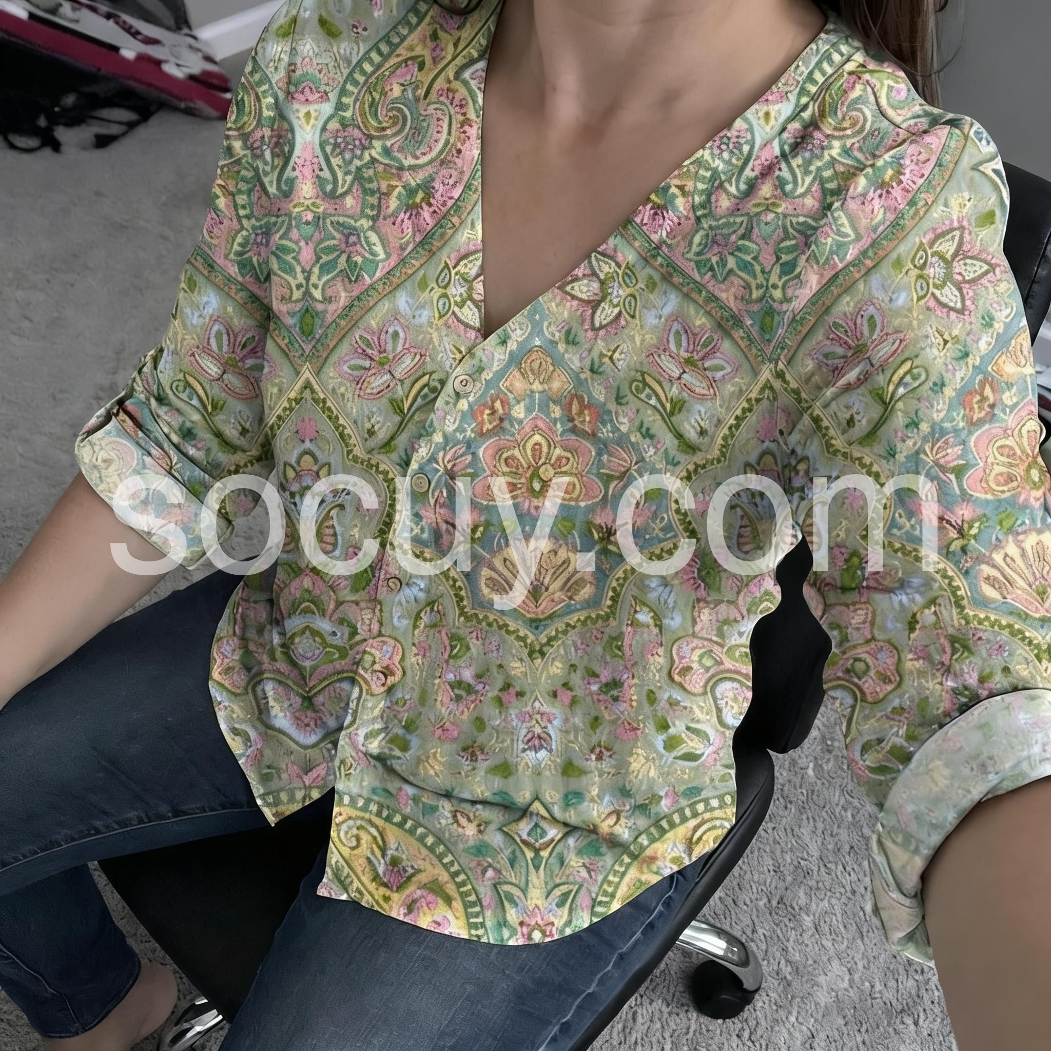 This long-sleeve top features a delicate floral and paisley print in soft pastel tones. The V-neckline and button-down front add a feminine touch. Relaxed fit with rolled sleeves for effortless style. Perfect paired with jeans or shorts. Ideal for casual outings or bohemian looks.