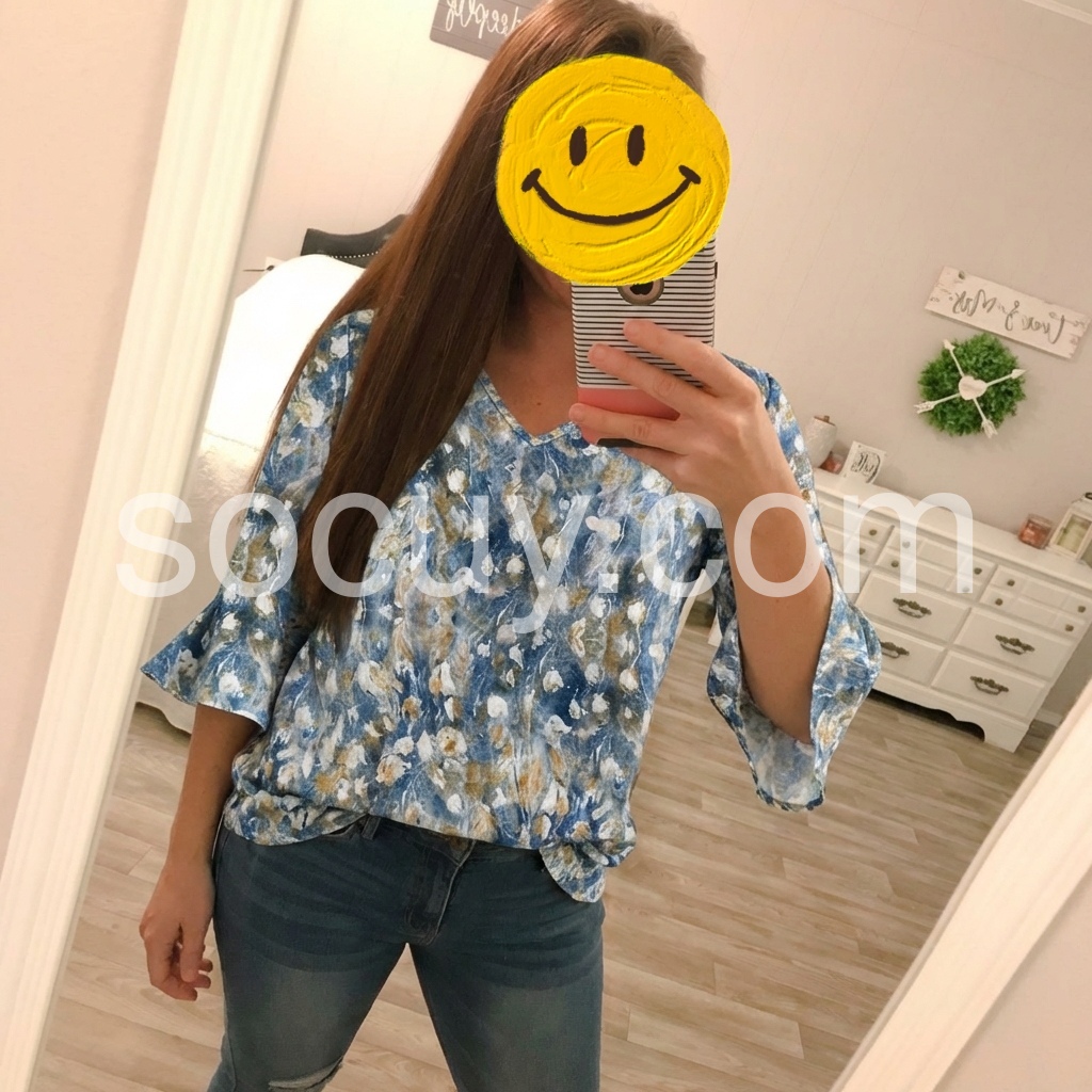 Channel romantic style with this beautiful blue floral blouse. The V-neck, flounce sleeves and flowy fit add feminine charm to your look.