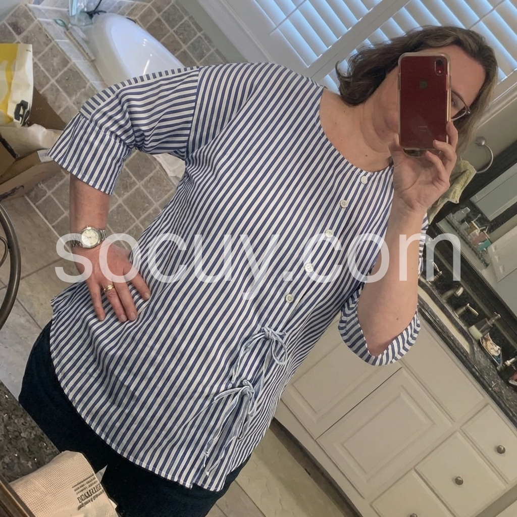 This loose-fit top features vertical blue and white stripes with a clean, casual look. Round neckline and front button-down design for easy wear. Side ties add a feminine touch. Three-quarter sleeves with rolled cuffs. Perfect for everyday comfort and effortless style.