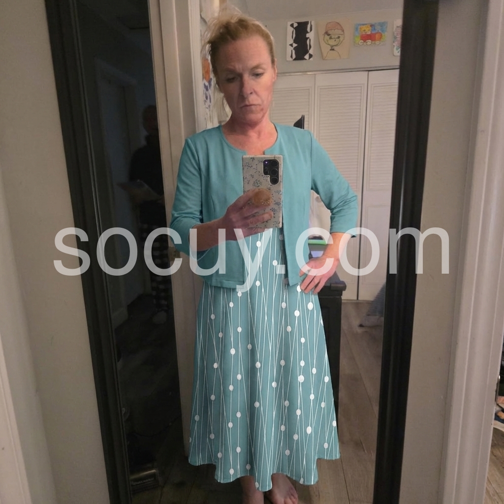 This flowing midi dress with white polka dots on a turquoise background. Paired with a matching short sleeve jacket for a polished look. Comfortable and stylish for casual outings or garden events. Lightweight fabric perfect for warm days. Effortlessly chic and feminine.