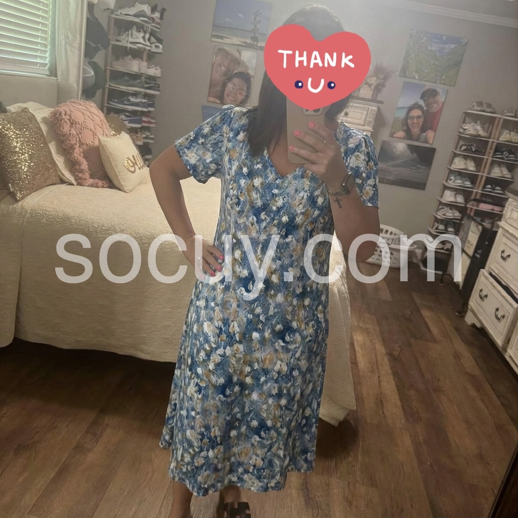 Crafted with dreamy oil-painting florals, this midi dress brings artistic elegance to your wardrobe. The V-neck, short sleeves and side slit create a flattering, flowy silhouette.