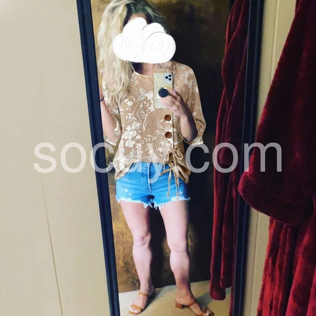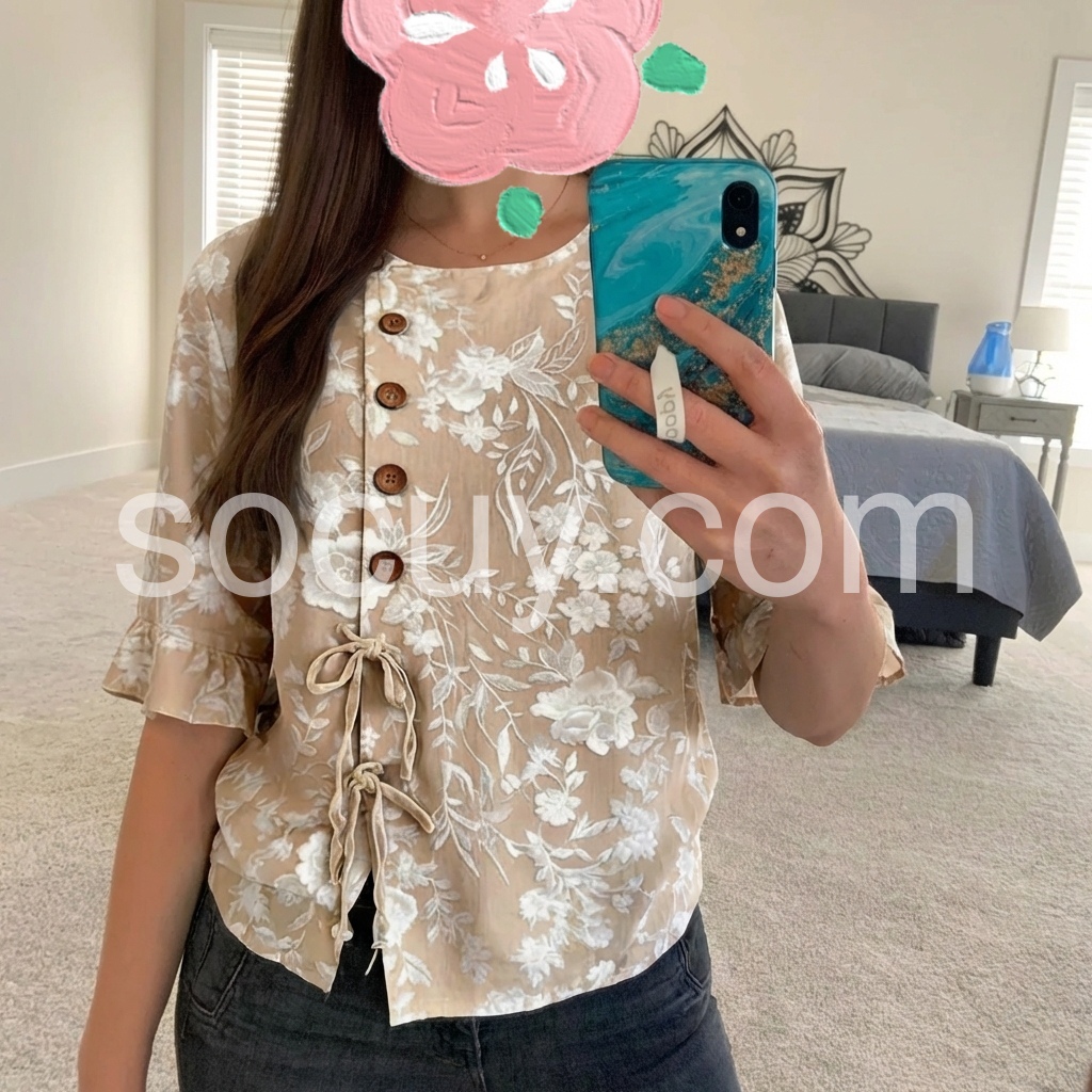 This loose-fitting top features a delicate white floral print on a beige background. Round neckline with wooden buttons and side tie detail. Three-quarter sleeves with ruffled cuffs for a feminine touch. Lightweight and breathable, perfect for casual wear. Ideal paired with jeans or pants.