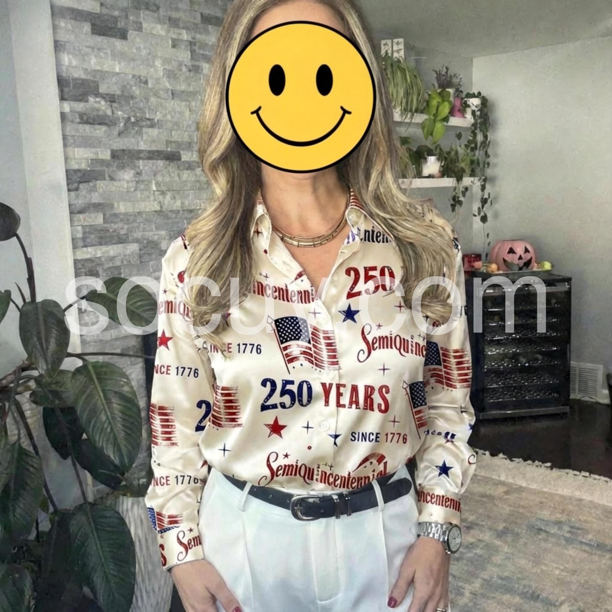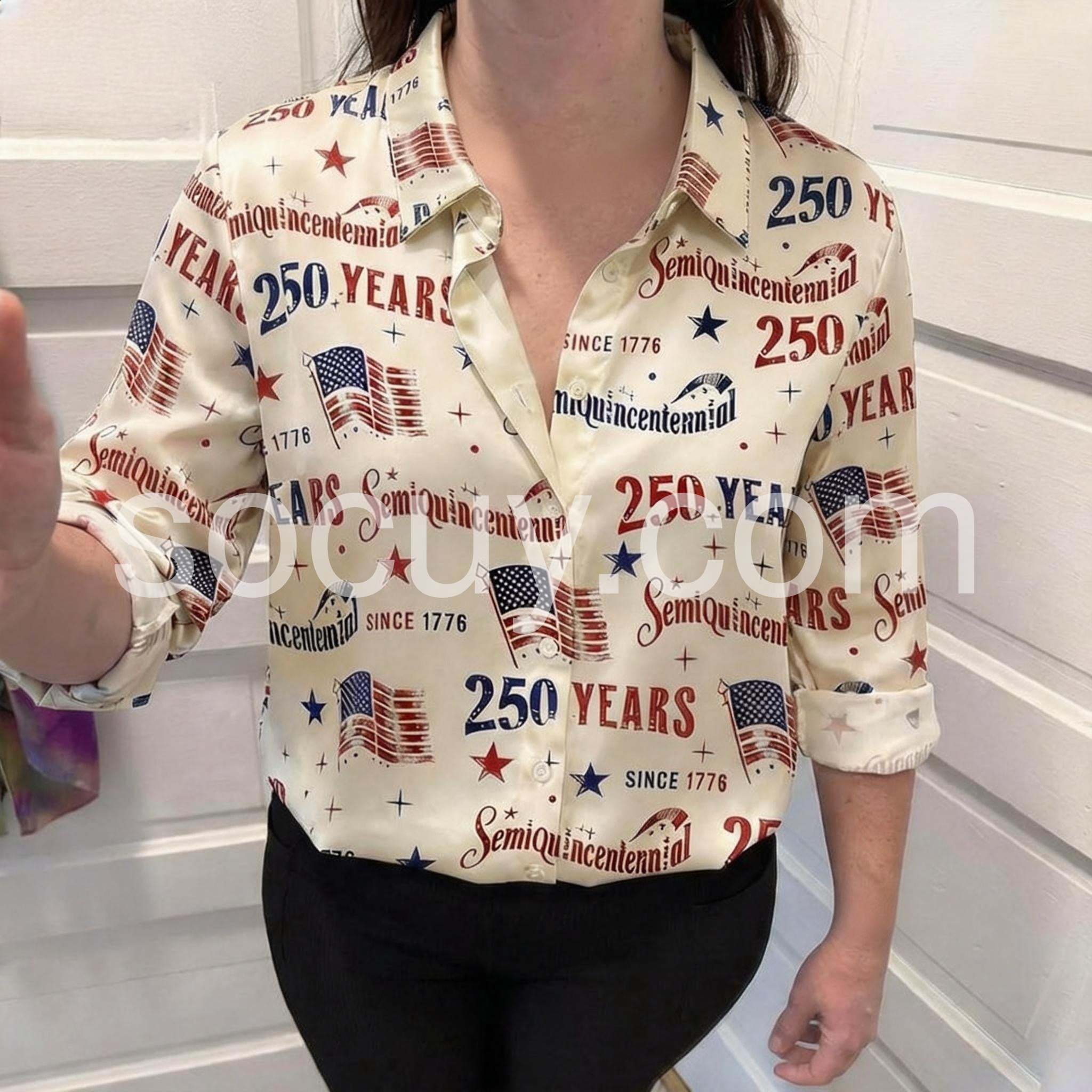 Celebrate the spirit of freedom in this Special Long Sleeve Satin Shirt , a bold and festive top that honors America’s upcoming Semiquincentennial milestone. Crafted from lustrous satin fabric, this long-sleeve blouse features a striking all-over print celebrating 250 years since 1776, with vibrant red, white, and blue accents including American flags, stars, and celebratory text like “Semi-Quincentennial” and “250 YEARS.” The classic button-down front and deep V-neckline offer a flattering, slightly edgy look, while the soft drape adds elegance and movement. With rolled-up sleeves and a relaxed fit, it’s perfect for pairing with dark denim jeans, white pants, or a high-waisted skirt—ideal for Fourth of July festivities, patriotic events, or summer celebrations.