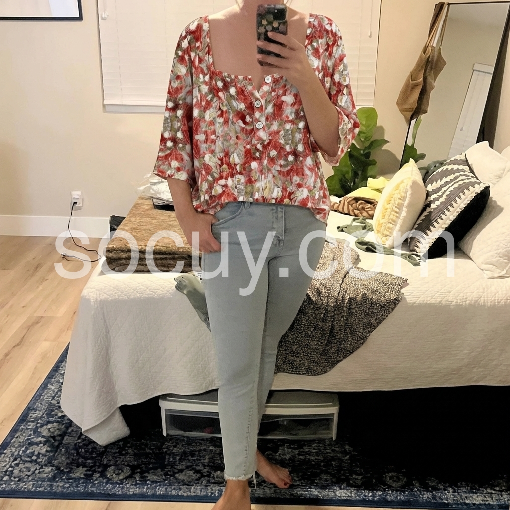 Perfect for weekend outings, casual workdays, or beachside strolls, this blouse effortlessly blends comfort and style, making it a versatile addition to your warm-weather wardrobe.