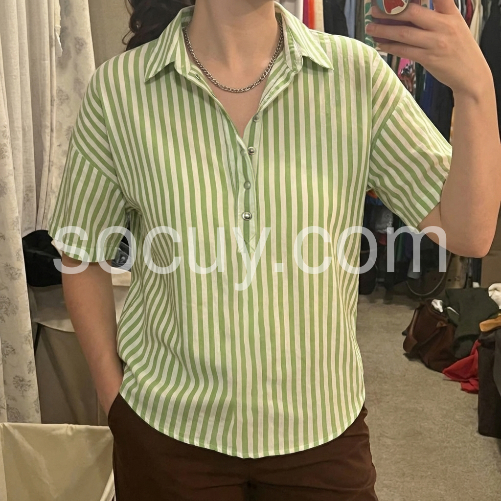 This blouse reimagines classic stripes with a modern, relaxed silhouette. The fresh green-and-white vertical print evokes timeless, preppy style.