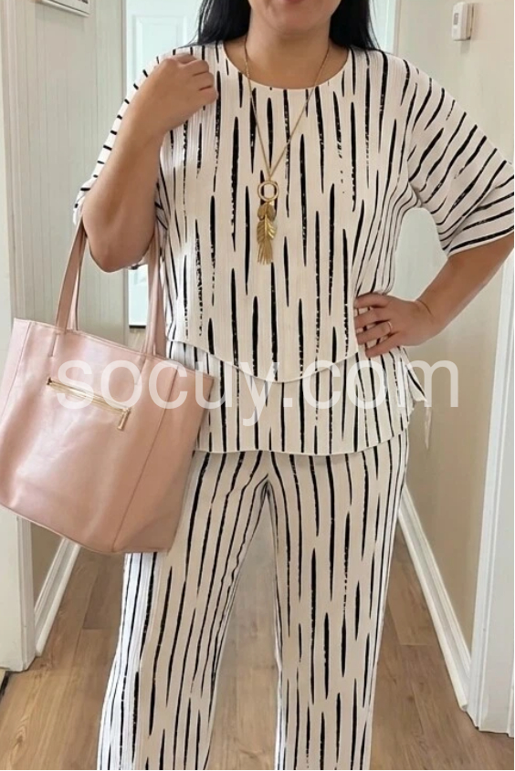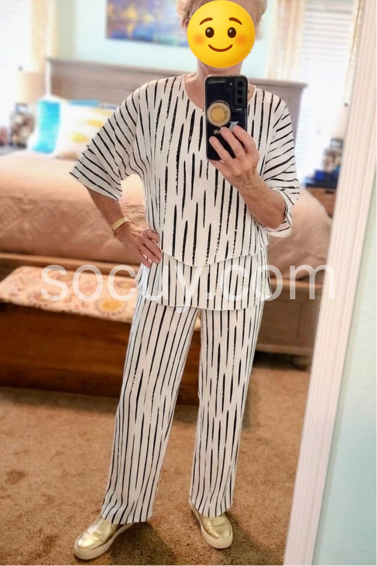 This coordinated set features a relaxed-fit top with wide sleeves and matching straight-leg pants. Bold vertical brushstroke pattern adds modern flair. Lightweight fabric perfect for warm weather. Ideal for casual outings or stylish days out. Effortlessly chic and easy to wear.